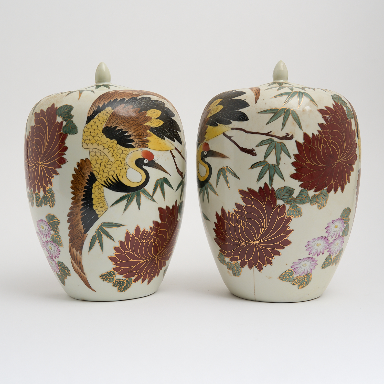 A PAIR OF CHINESE GINGER JARS, DECORATED WITH CRANES AND FLOWERS H.32CM (A/F)
