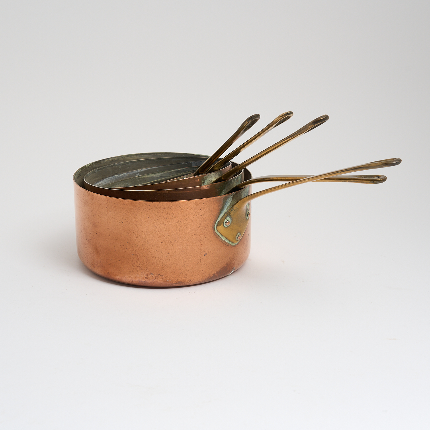 A GRADUATED SET OF FIVE FRENCH COPPER BRASS HANDLE SAUCEPANS L.39CM (LARGEST)