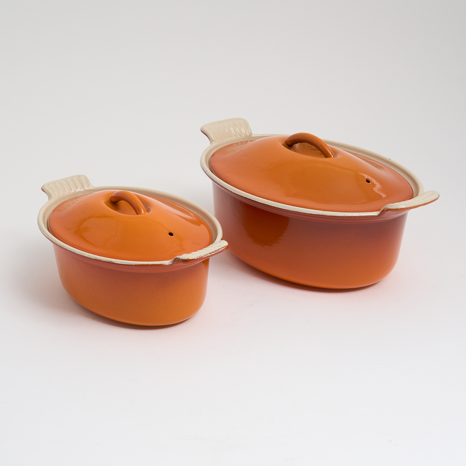 TWO CAST IRON ENAMEL LIDDED CASSEROLES BY COUSANCES L.27.5