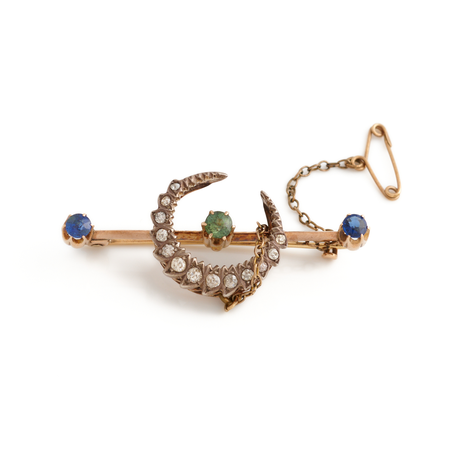 AN ANTIQUE DIAMOND AND SAPPHIRE CRESCENT BROOCH IN 15CT GOLD AND SILVER, EACH SAPPHIRE APPROXIMATELY 0.20CTS, DIAMONDS TOTALLING APPROXIMATELY 0.63CTS, 44 X 20MM