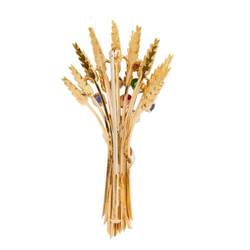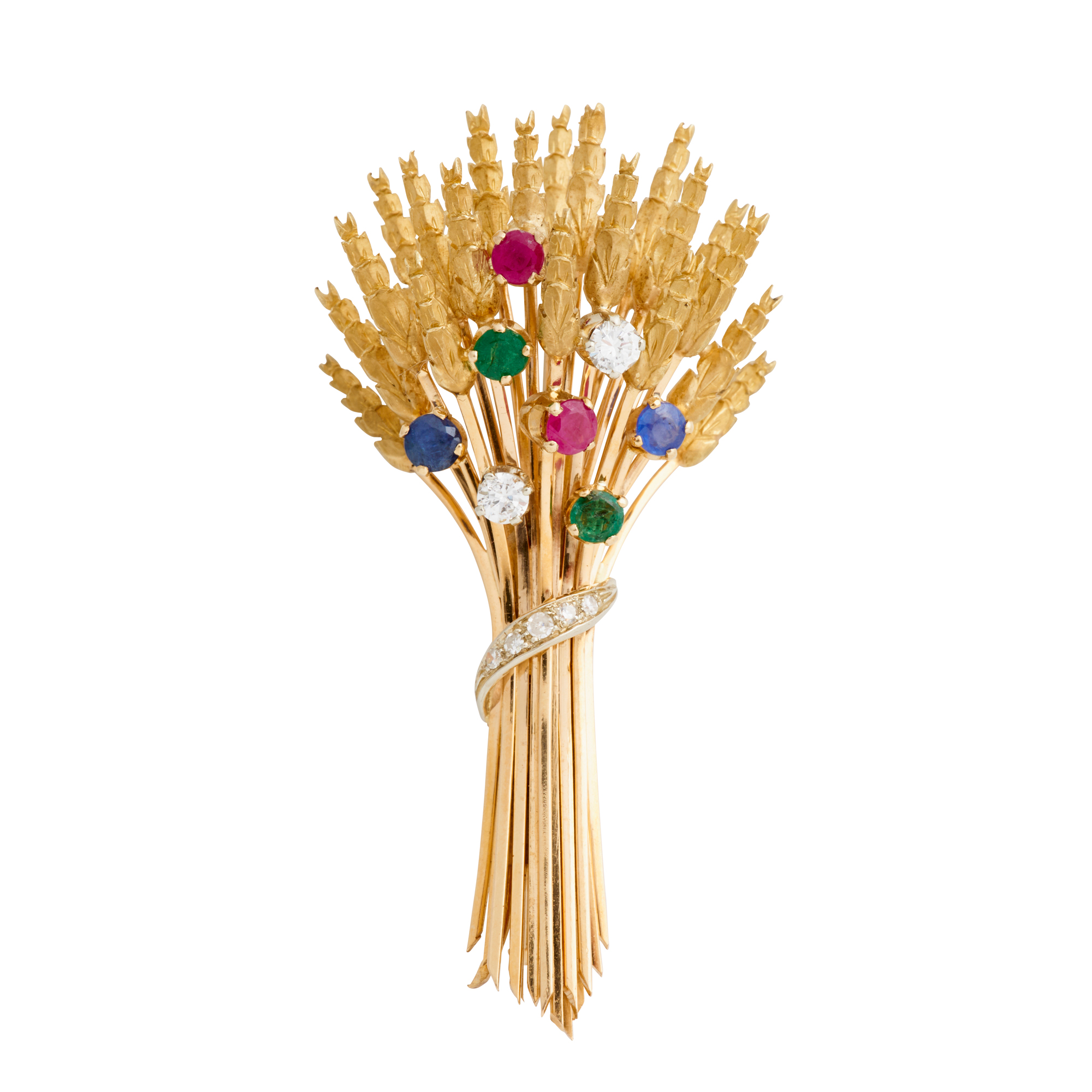 Modelled as a wheat sheaf detailed with claw-set round brilliant-cut diamonds together weighing approximately 0.37 carats and claw-set circular-cut rubies, sapphires and emeralds, together weighing approximately 0.45 carats, 0.40 carats and 0.30 carats respectively, length 60mm, width 30mm, gross weight approximately 17.3 grams.