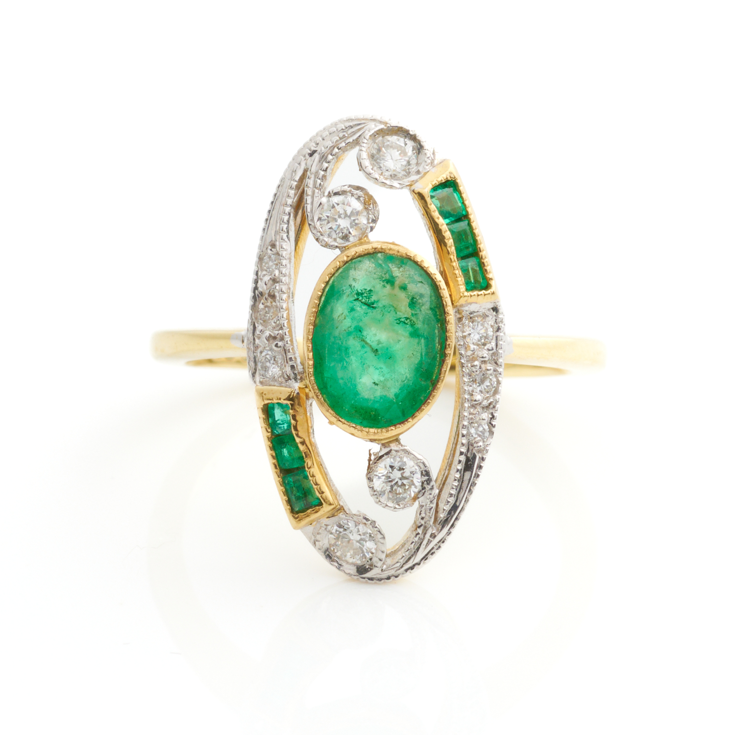 AN EMERALD AND DIAMOND RING IN 18CT GOLD, SIZE N 1/2, 4.4GMS