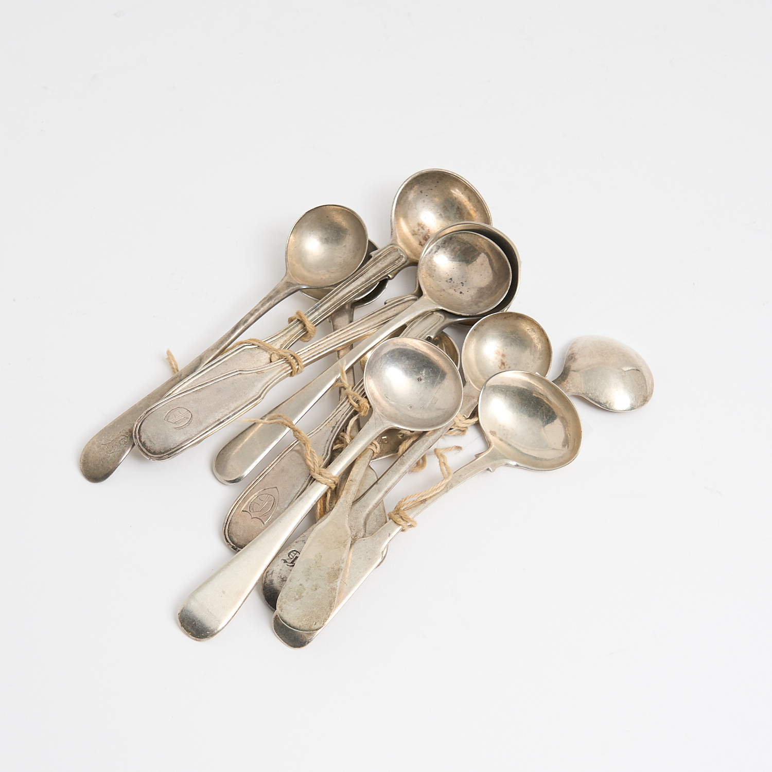 A COLLECTION OF GEORGIAN AND LATER STERLING SILVER MUSTARD SPOONS 180G L.10CM (LONGEST)
