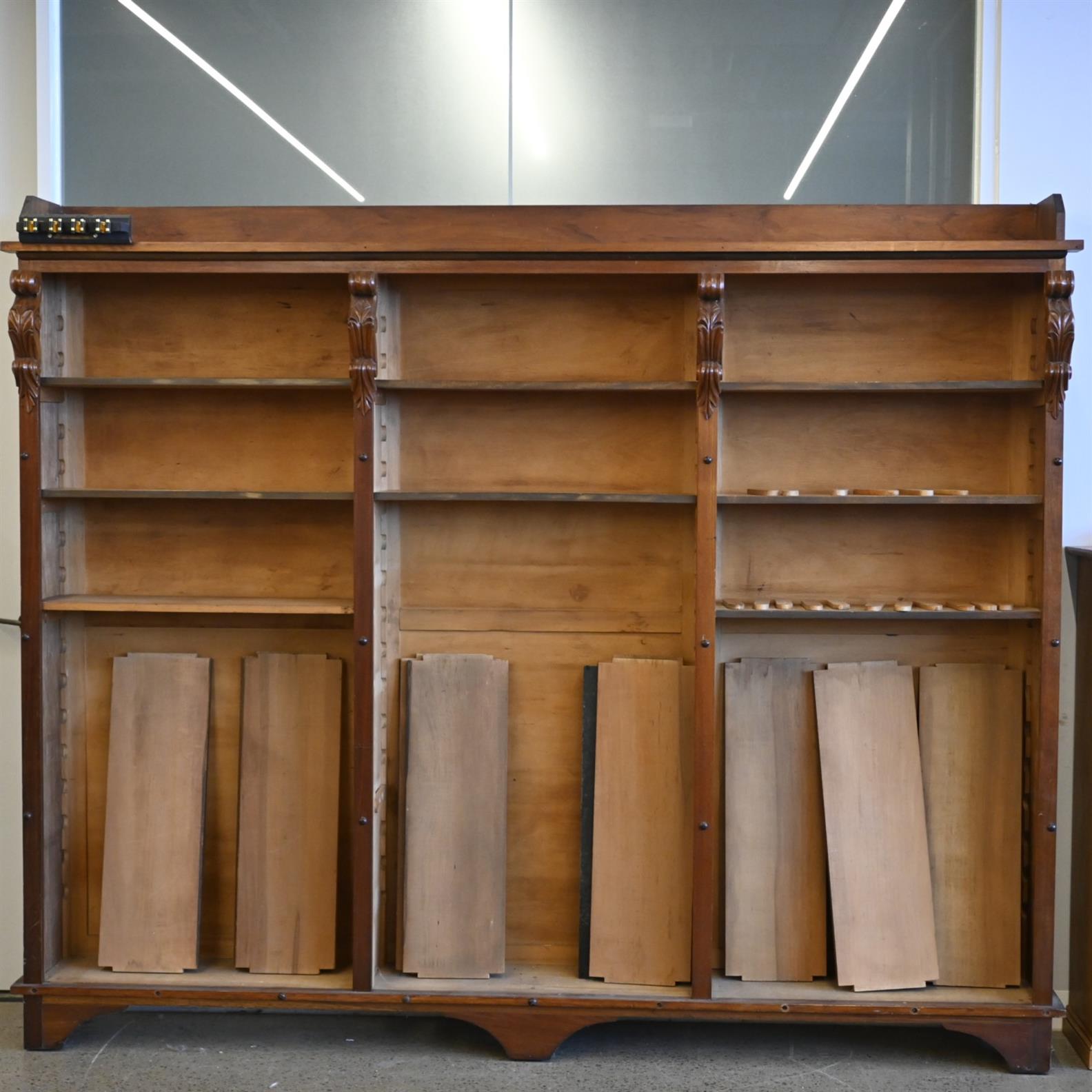 A LARGE EARLY 20th CENTURY AUSTRALIAN BLACKWOOD THREE-BAY OPEN BOOKCASE, WITH ADJUSTABLE SHELVES HEIGHT 206CM, WIDTH 250CM DEPTH 36CM (THIS ITEM MUST BE REMOVED BY CARRIERS AT THE CUSTOMER'S EXPENSE. LEONARD JOEL STAFF CANNOT ASSIST CARRYING THIS ITEM)
