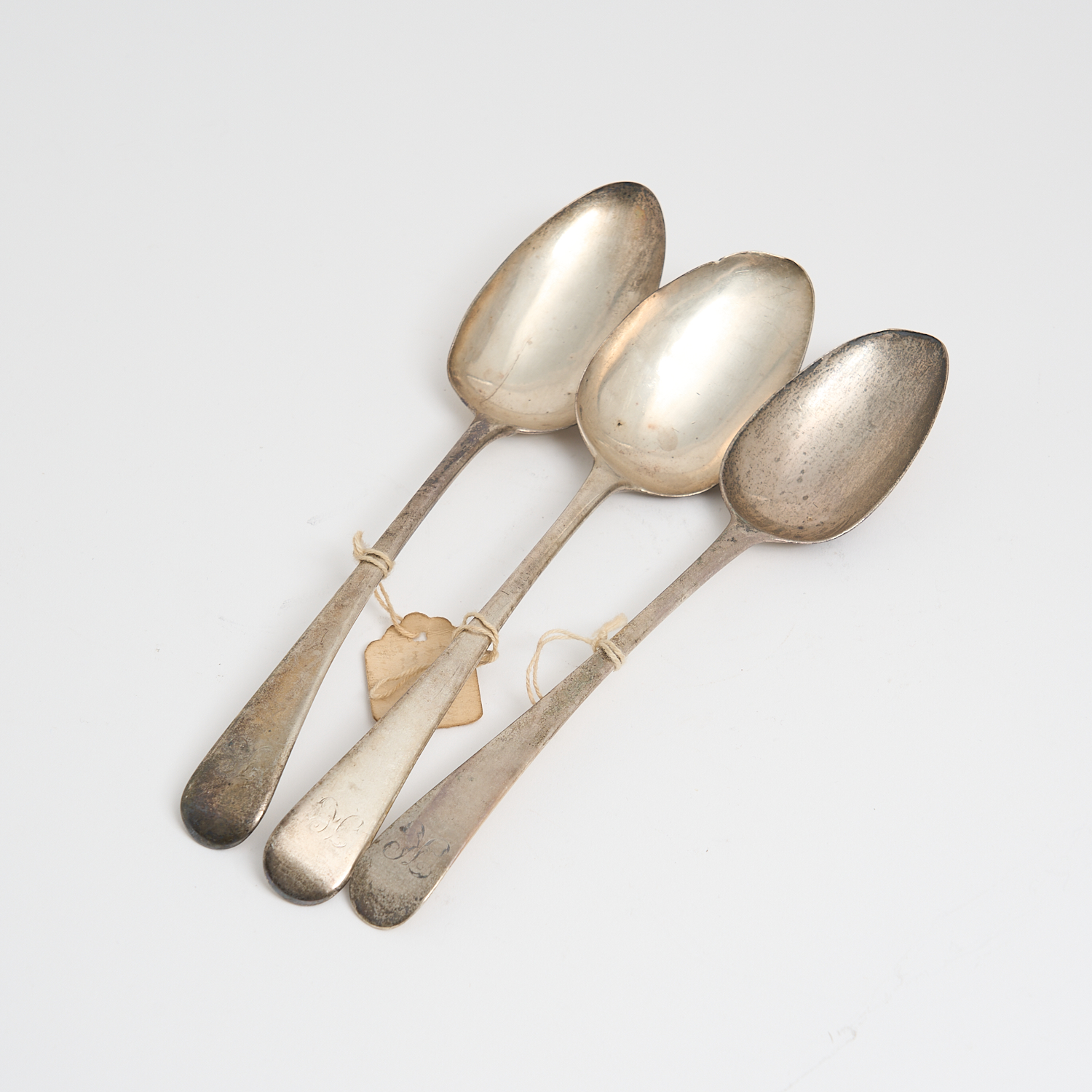 THREE GEORGIAN STERLING SILVER SERVING SPOONS ALL BEARING THE SAME MONOGRAM, 172G L.21CM