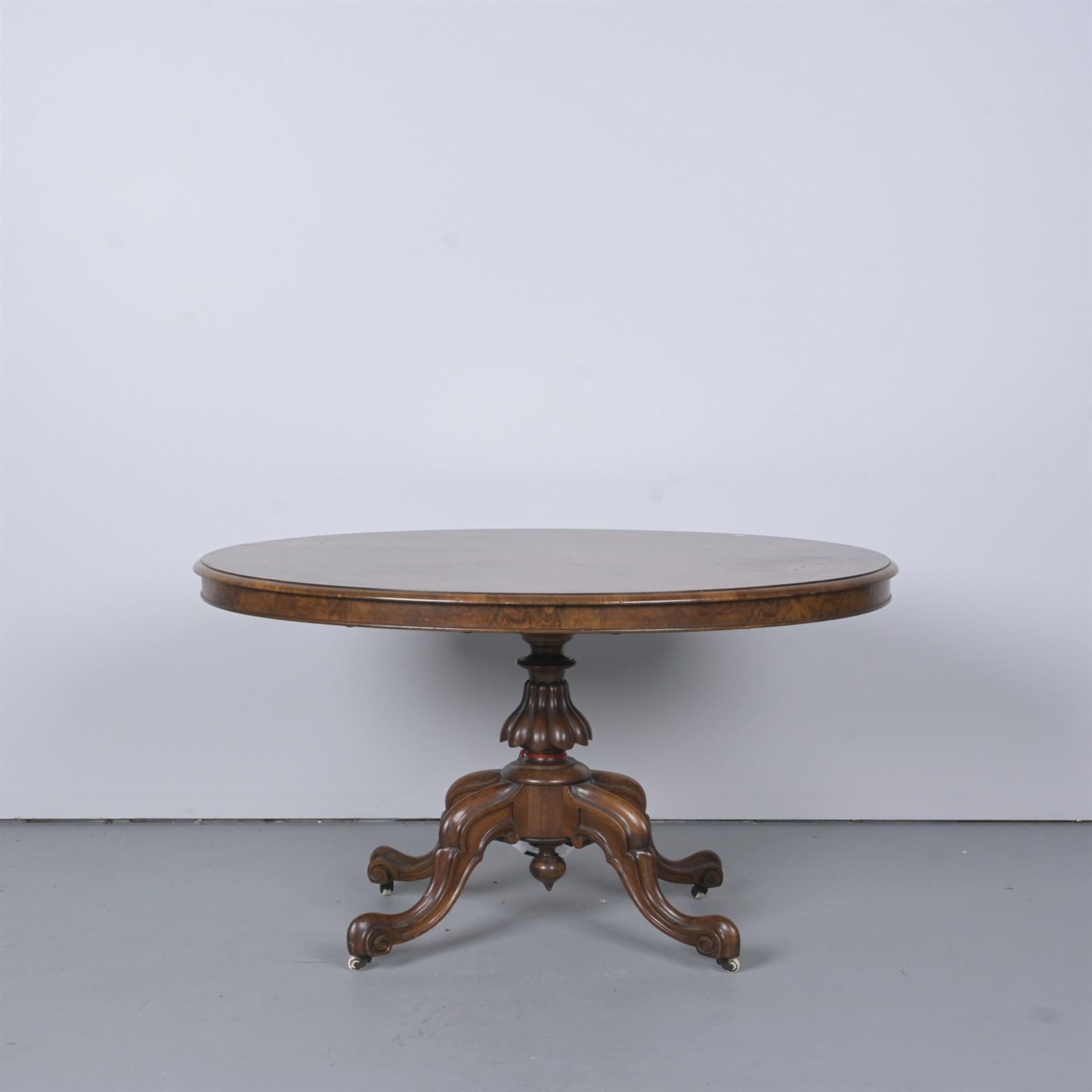 A VICTORIAN FIGURED WALNUT OVAL CENTRE TABLE (72CM H X 130CM W X 96CM D)