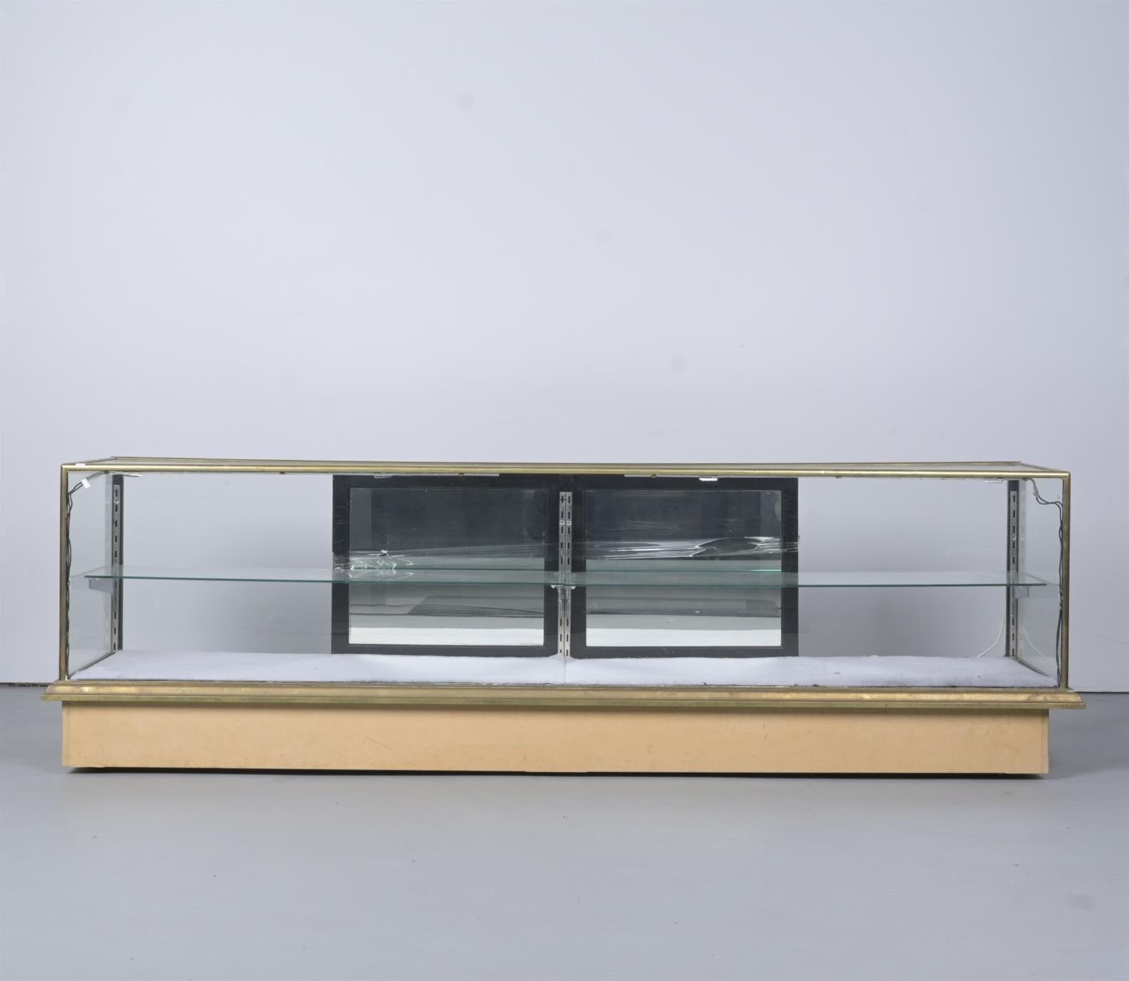 A LARGE EARLY 20th CENTURY BRASS-BOUND GLAZED COUNTER-TOP DISPLAY CASE BY DUFF, LATER MOUNTED ON PLINTH BASE WITH CASTERS AS A LOW CABINET (73CM H X 239CM W X 58CM D) (THIS ITEM MUST BE REMOVED BY CARRIERS AT THE CUSTOMER'S EXPENSE. LEONARD JOEL STAFF CANNOT ASSIST CARRYING THIS ITEM)