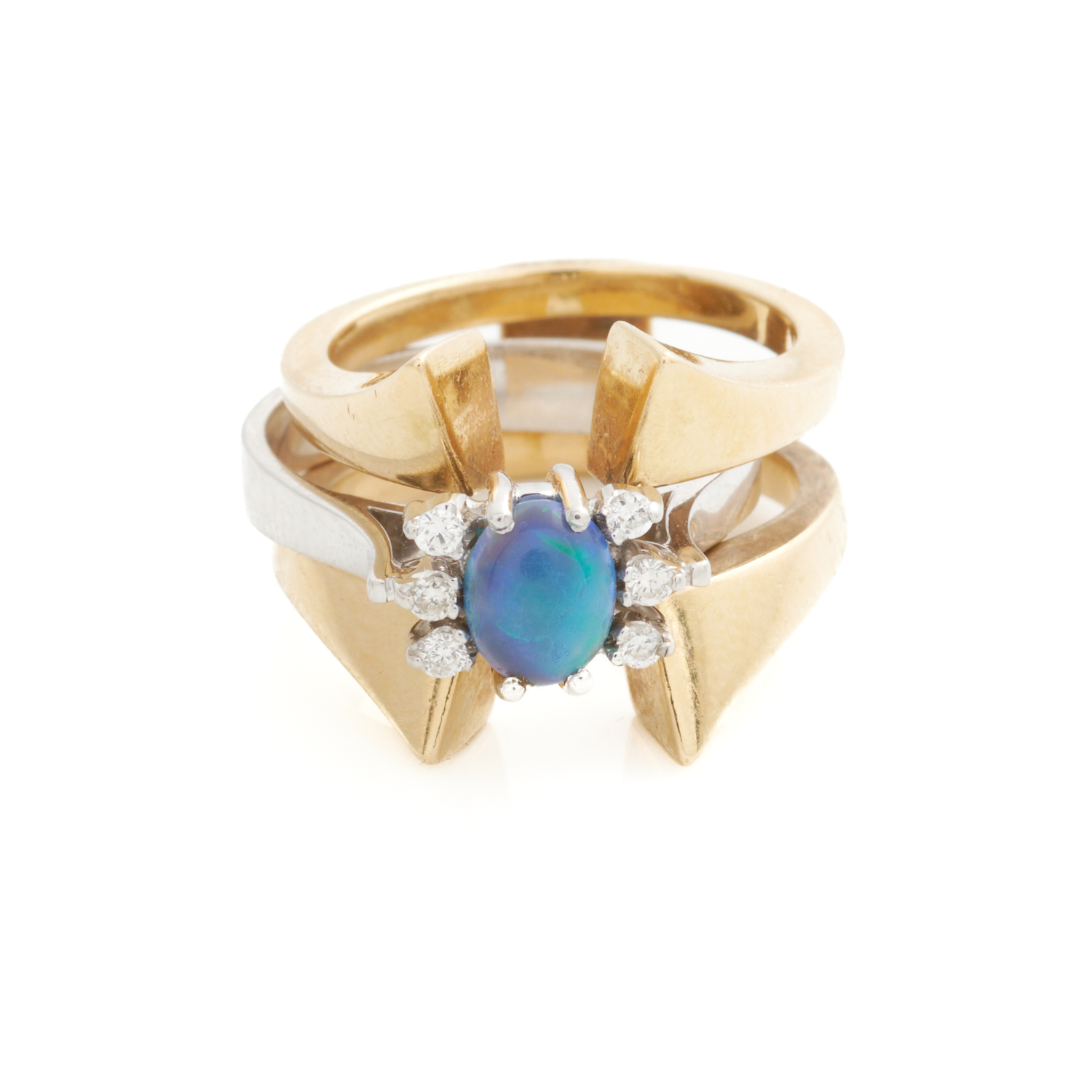 AN AUSTRALIAN BLACK OPAL AND DIAMOND RING IN 14CT TWO TONE GOLD, THE OPAL MEASURING APPROXIMATELY 6.2 X 4.9MM, THE RINGS OF CONVERTIBLE 'JACKET' DESIGN, SIZE I 1/2 - K, 12.3GMS
