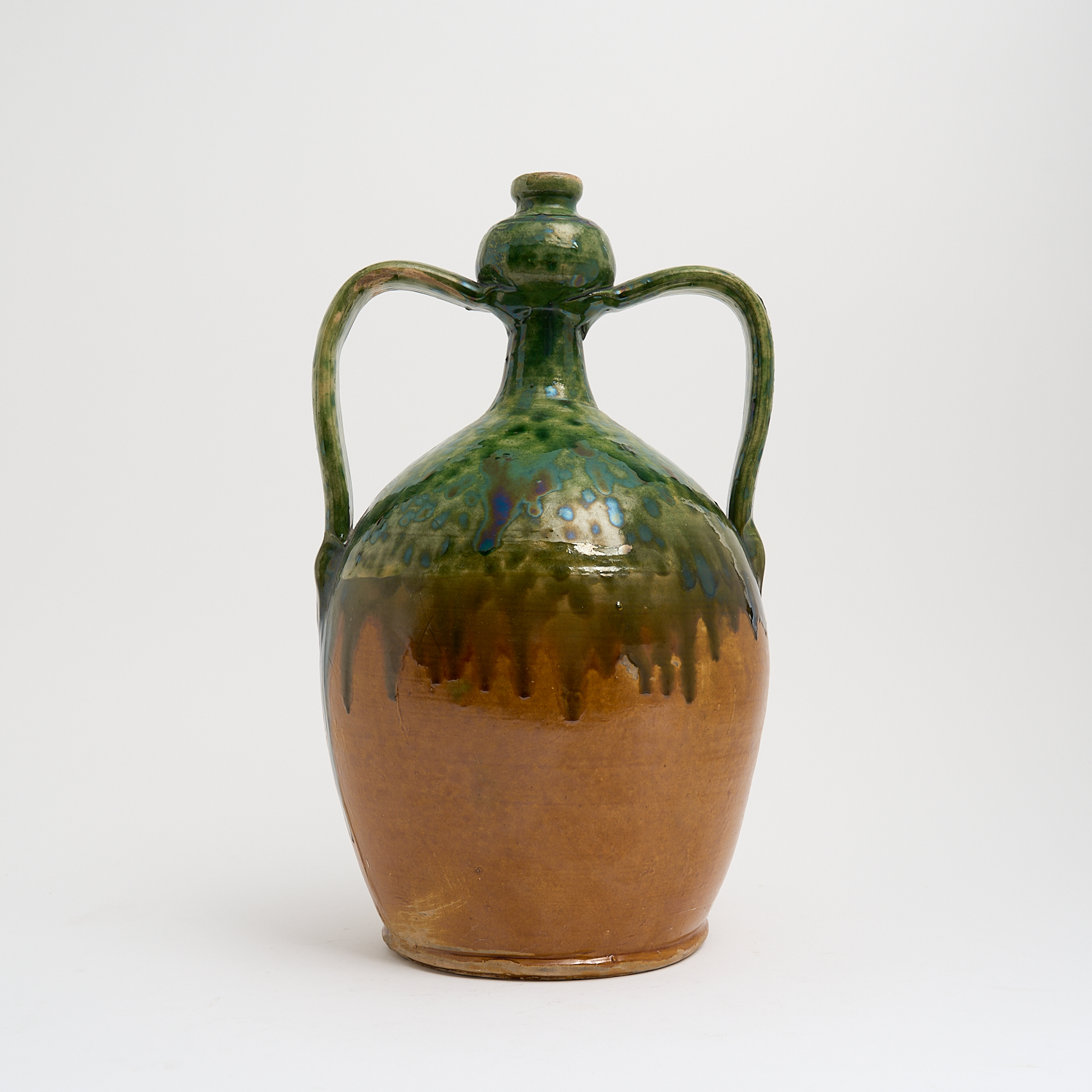 A FRENCH DIP GLAZE TWIN HANDLED TERRACOTTA VASE H.42CM