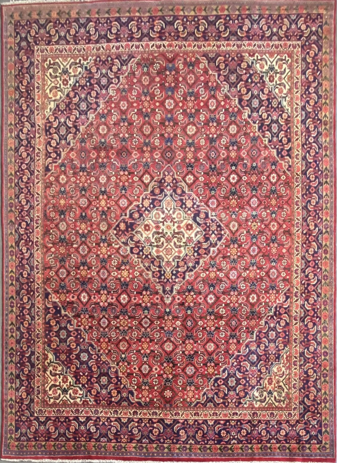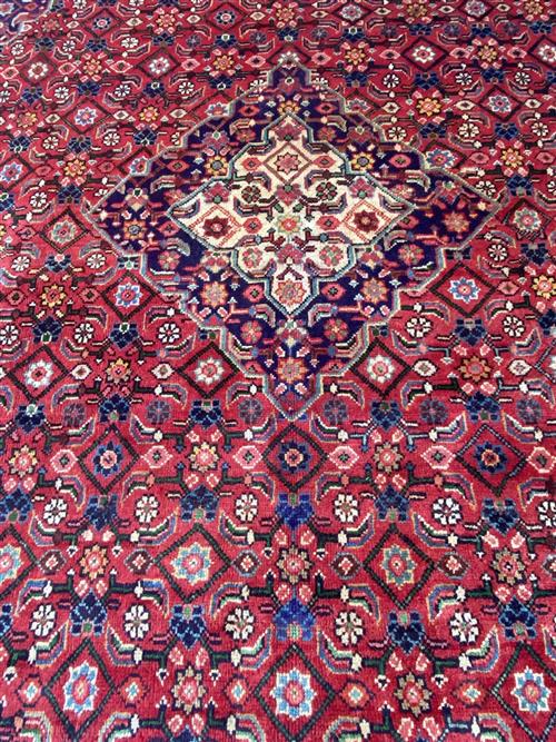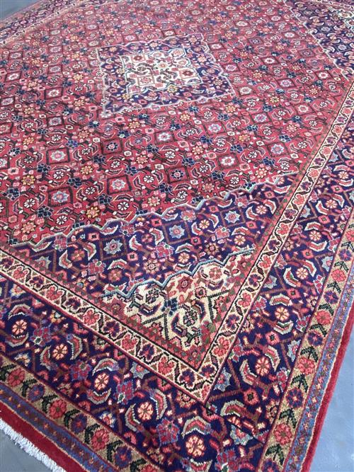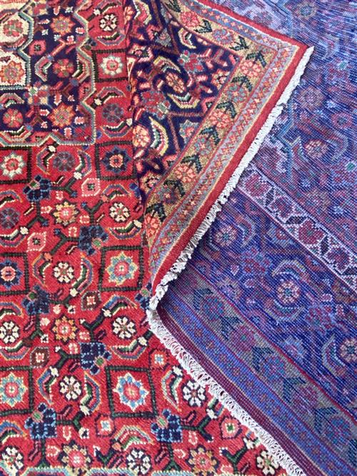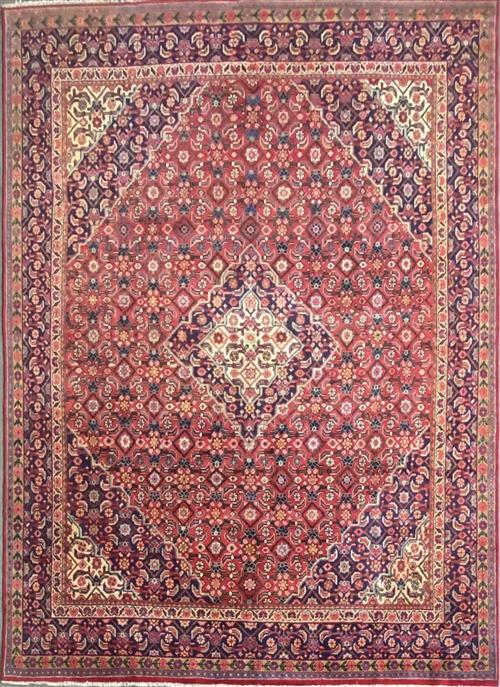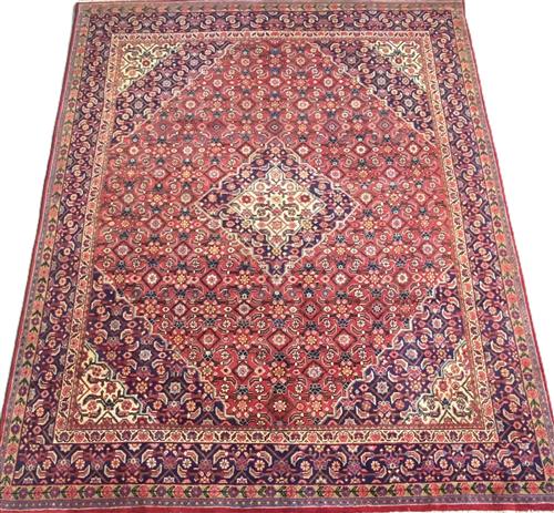 100% PLUSH & SOLID WOOL PILE & ALL NATURAL DYES. HAND-KNOTTED CITY WEAVE FROM THE ARAK REGION WITH TRADITIONAL DESIGN OF A HERATI-PATTERNED MEDALLION & QUARTERED CORNER MEDALLIONS IN A RED FIELD OF FLORAL HERATI MAHI PATTERNS. INDIGO-TONED BORDER OF HERATI MAHI MOTIFS.
