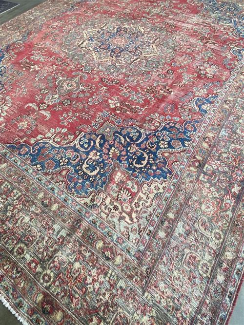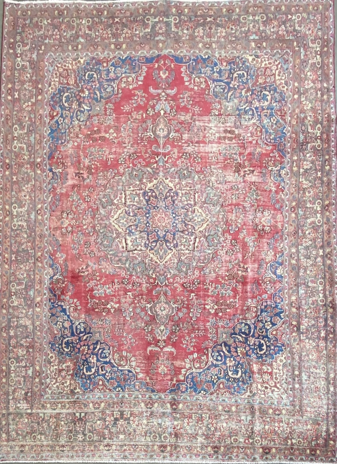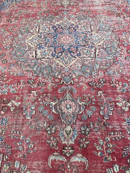 ANTIQUE VINTAGE WOOL PILE. GALLERY EXHIBITED. HAND-KNOTTED CITY WEAVE FROM THE NORTH-EASTERN KHORASAN PROVINCE WITH CLASSIC DESIGN OF A BOLD FLORAL MEDALLION & QUARTERED CORNER MEDALLIONS IN A FIELD OF BLOSSOMING FLORAL SPRAYS. BORDER OF FLORAL SPRAYS. THE ENTIRE IN SHADES IF CRIMSON, FRENCH BLUE, TURQUOISE & CARAMEL.