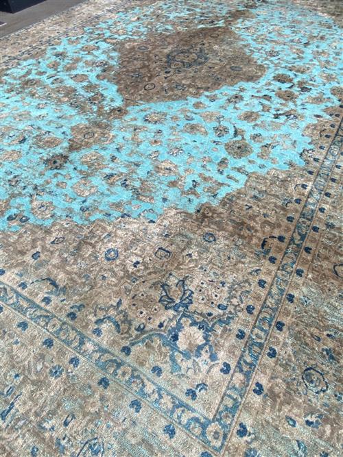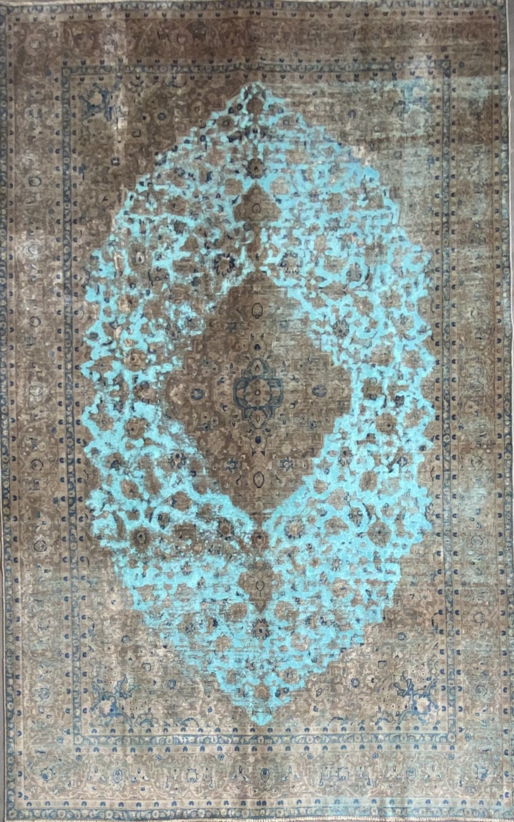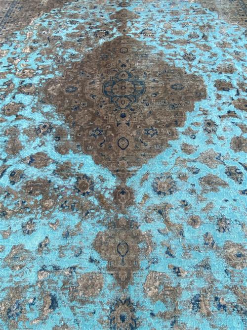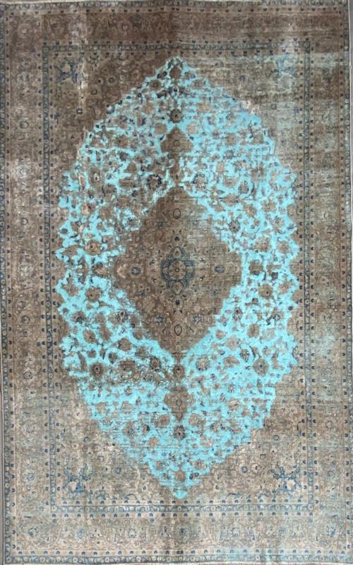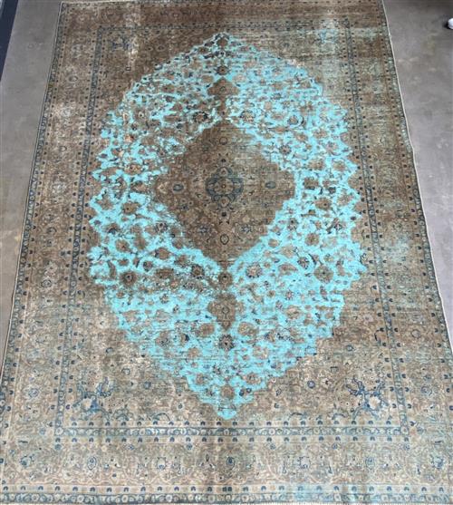GALLERY EXHIBITED. VINTAGE WOOL PILE. A DESIGNER RUG CREATED FROM A HAND-KNOTTED PERSIAN KASHAN WITH A MEDALLION DESIGN. THE RUG IS UNIQUELY HAND-DYED IN A SHADES OF TURQUOISE, BISCUIT & CORNFLOWER BLUE.