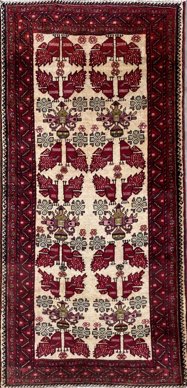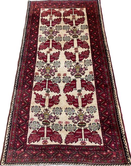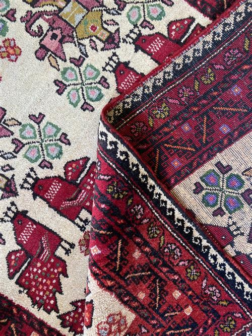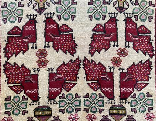 100% WOOL PILE. FINELY HAND-KNOTTED TRIBAL WEAVE FROM THE KHORASAN PROVINCE WITH TRIBAL DESIGN OF DOUBLE ROWS OF SYMMETRICAL PEACOCKS SET AGAINST TRIBAL GUL MOTIFS. GEOMETRIC-PATTERNED BORDER. SOLID & HARD-WEARING.