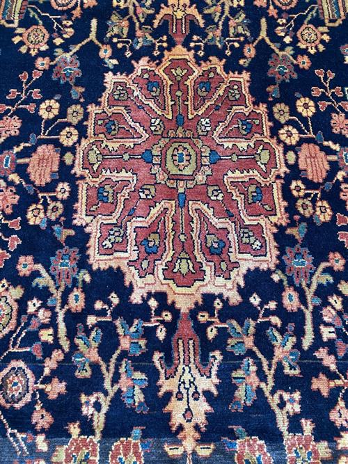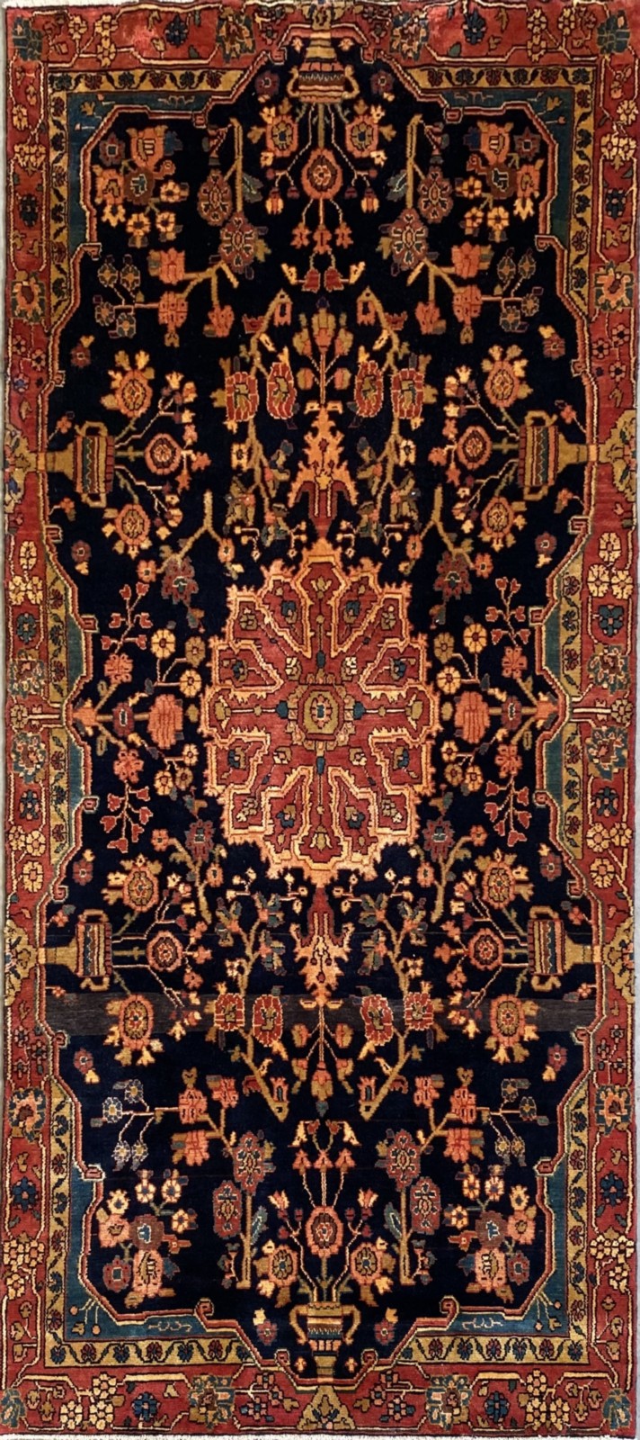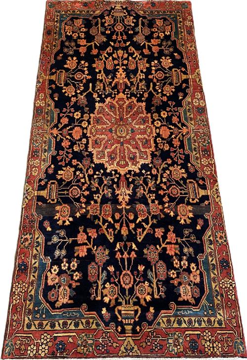 LOCALLY SOURCED VEGETABLE DYES WITH NATURAL ABRASH DISCOLOURATION. HAND-KNOTTED VILLAGE WEAVE FROM THE HAMADAN REGION WITH DISTINCT DESIGN OF CENTRAL STYLIZED MEDALLION IN A DEEP INDIGO FIELD OF URNS BEARING FLORAL FOLIAGE & FLORAL SPRAYS. BORDER OF ROSETTES & FLOWER HEADS. THE ENTIRE IN SHADES OF INDIGO, BLUE, CREAM & TERRACOTTA.
