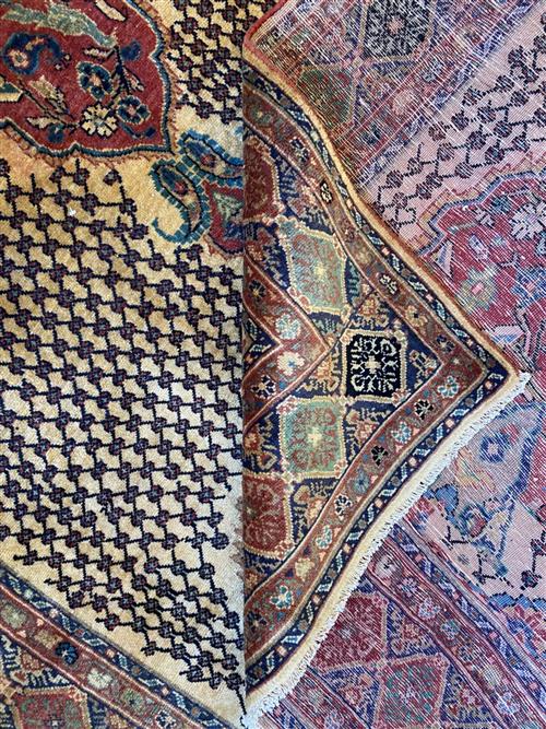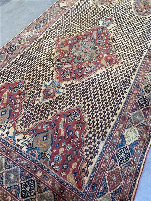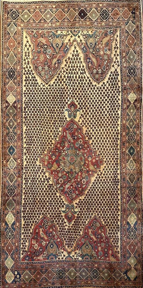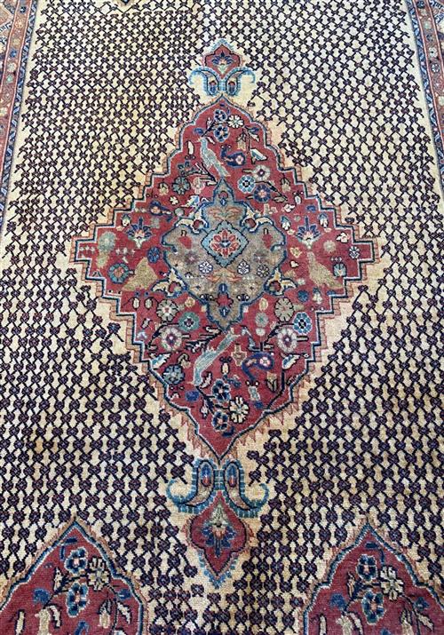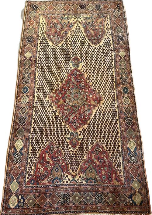 SEMI-VINTAGE PILE APPROPRIATE TO AGE. HAND-KNOTTED SEMI-TRIBAL WEAVE FROM THE KURDISTAN REGION WITH ANCHORED FLORAL MEDALLION AND INNER PANELS CONTAINING FLORAL & PAISLEY MOTIFS & BIRDS OF PARADISE SET WITHIN A LATTICED FIELD. BORDER OF REPEATING DIAMOND PATTERNS. THE ENTIRE IN SHADES OF CREAM, ROSE, BLUES & CHARCOAL.