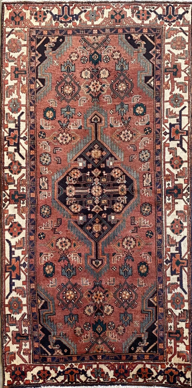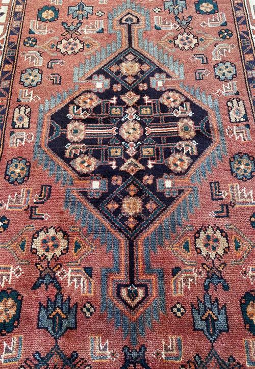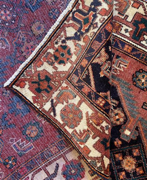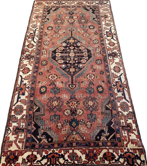 HAND-WOVEN VILLAGE WEAVE FROM THE HAMADAN REGION WITH TRIBAL DESIGN OF ANCHORED MEDALLION & CORNER MEDALLIONS IN A FIELD OF BOLD HERATI MAHI PATTERNS. BORDER OF HERATI PATTERNS & ROSETTES.