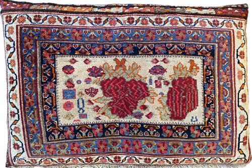 HAND-WOVEN TRIBAL RUG WITH FLORAL PATTERNS & BORDER OF FLOWER HEADS WITH A HAND-WOVEN KILIM FINISH & BACKING.
