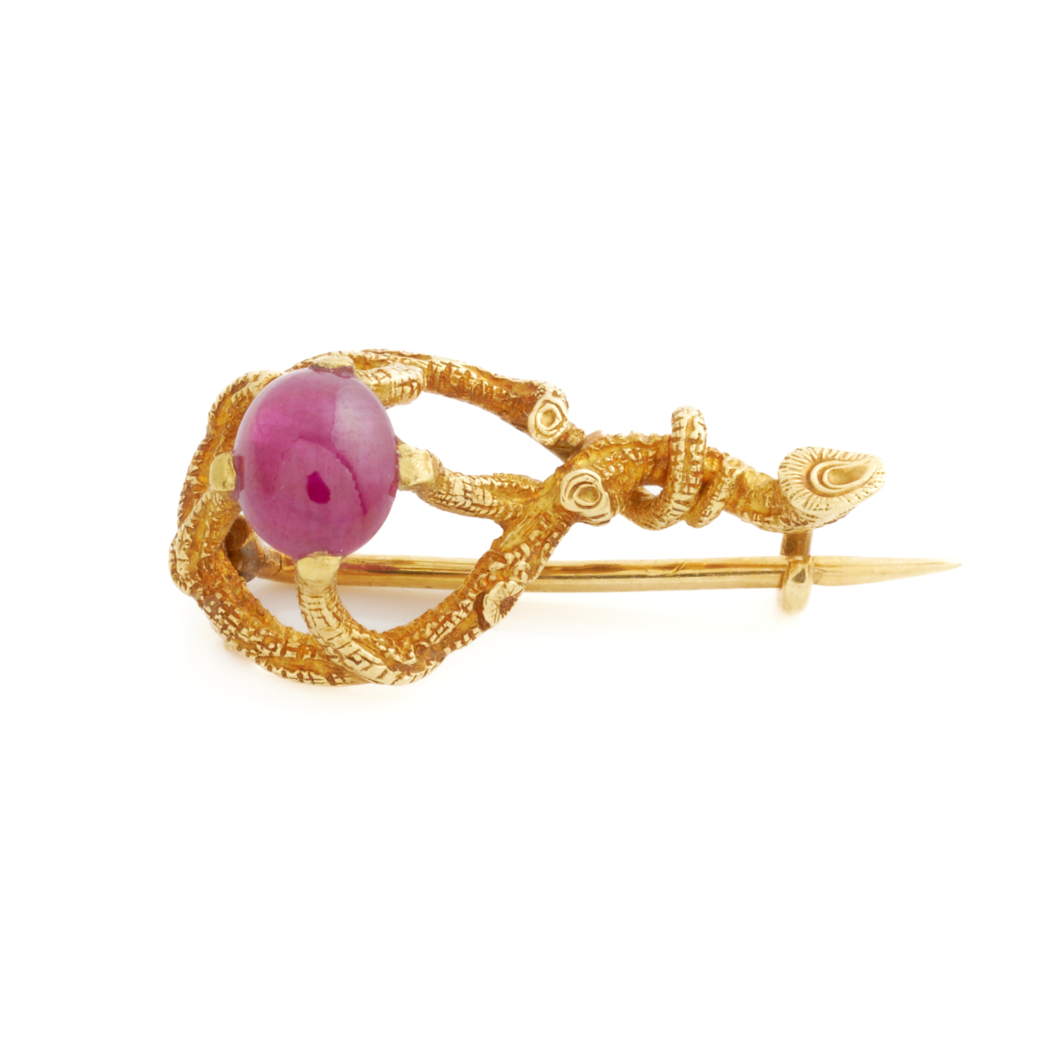 AN ANTIQUE RUBY BROOCH IN 18CT GOLD, THE RUBY WEIGHING 1.15CTS, 21MM, 3.1GMS