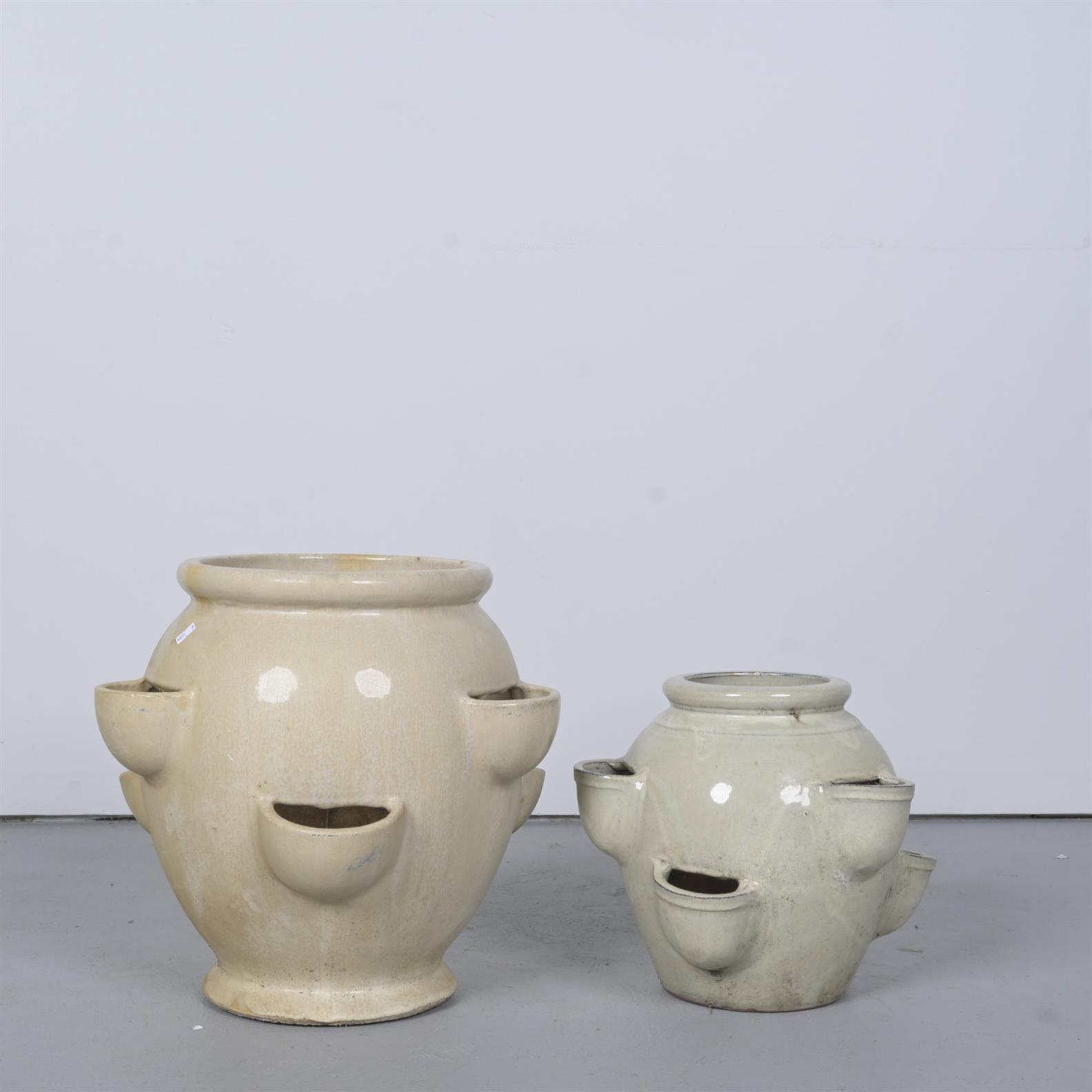 A PAIR OF GLAZED TERRACOTTA PLANTER POTS (42CM H, LARGEST)