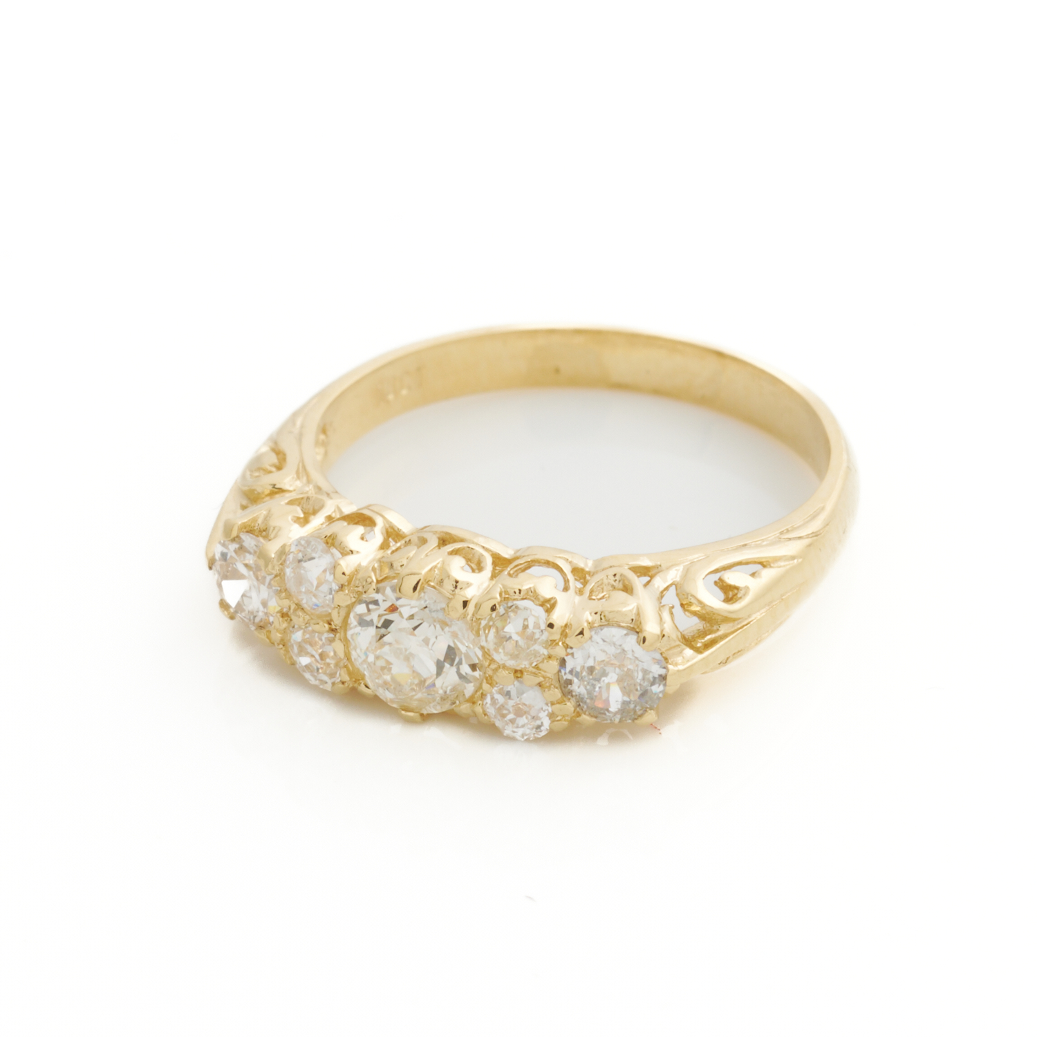 A VICTORIAN STYLE DIAMOND HALF HOOP BAND IN 18CT GOLD, THE OLD MINE CUT DIAMONDS TOTALLING APPROXIMATELY 1.14CTS, SIZE O, 3.5GMS