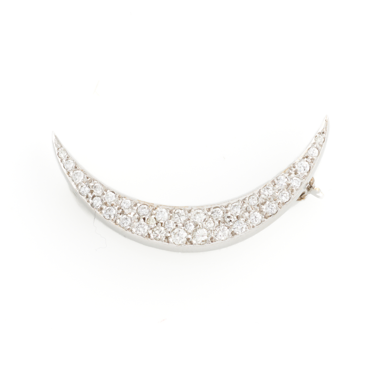 A DIAMOND CRESCENT MOON BROOCH IN 9CT WHITE GOLD, THE DIAMONDS TOTALLING APPROXIMATELY 0.50CTS, 36 X 15MM
