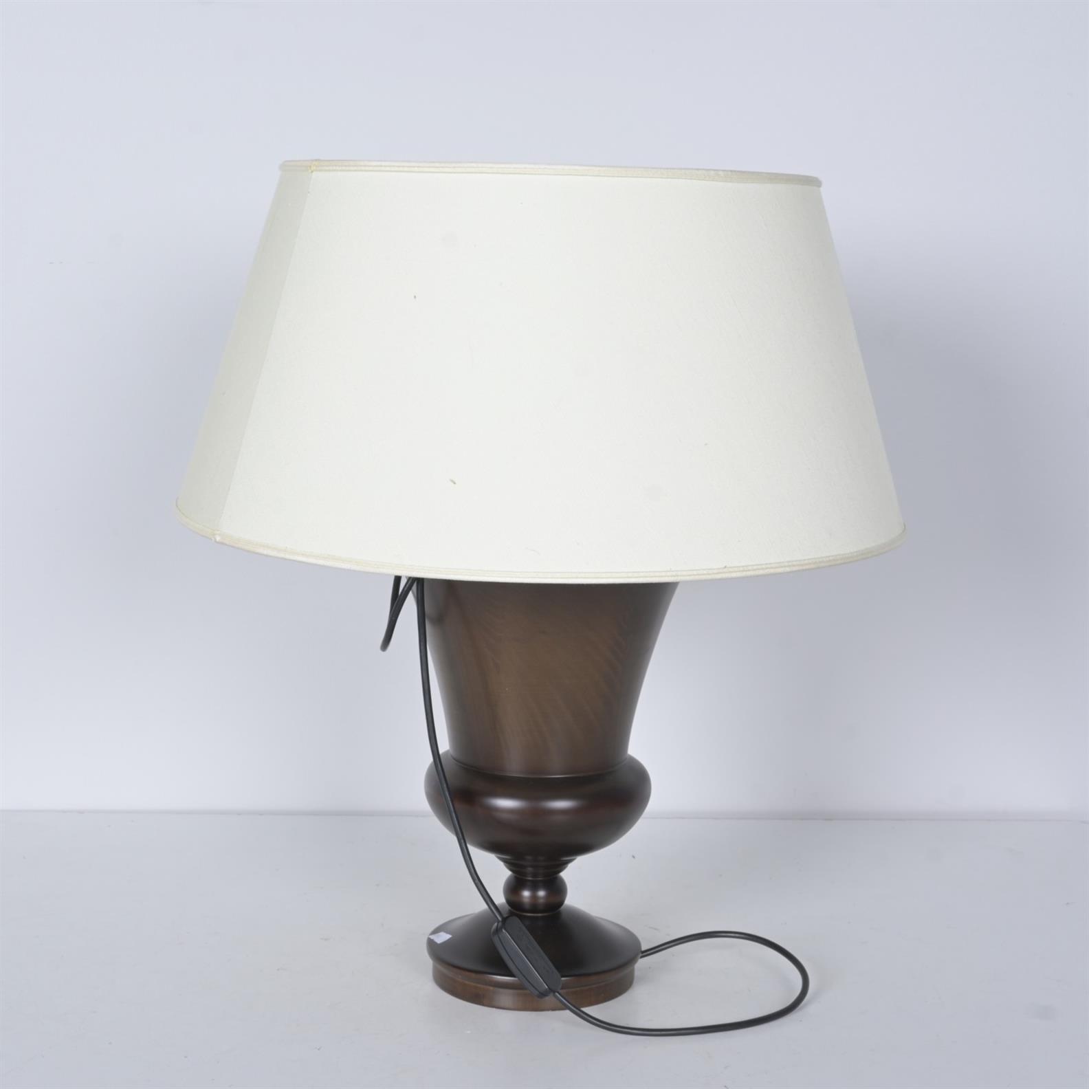 A CONTEMPORARY WOODEN BASE LAMP (60CM H X 52CM DIA)