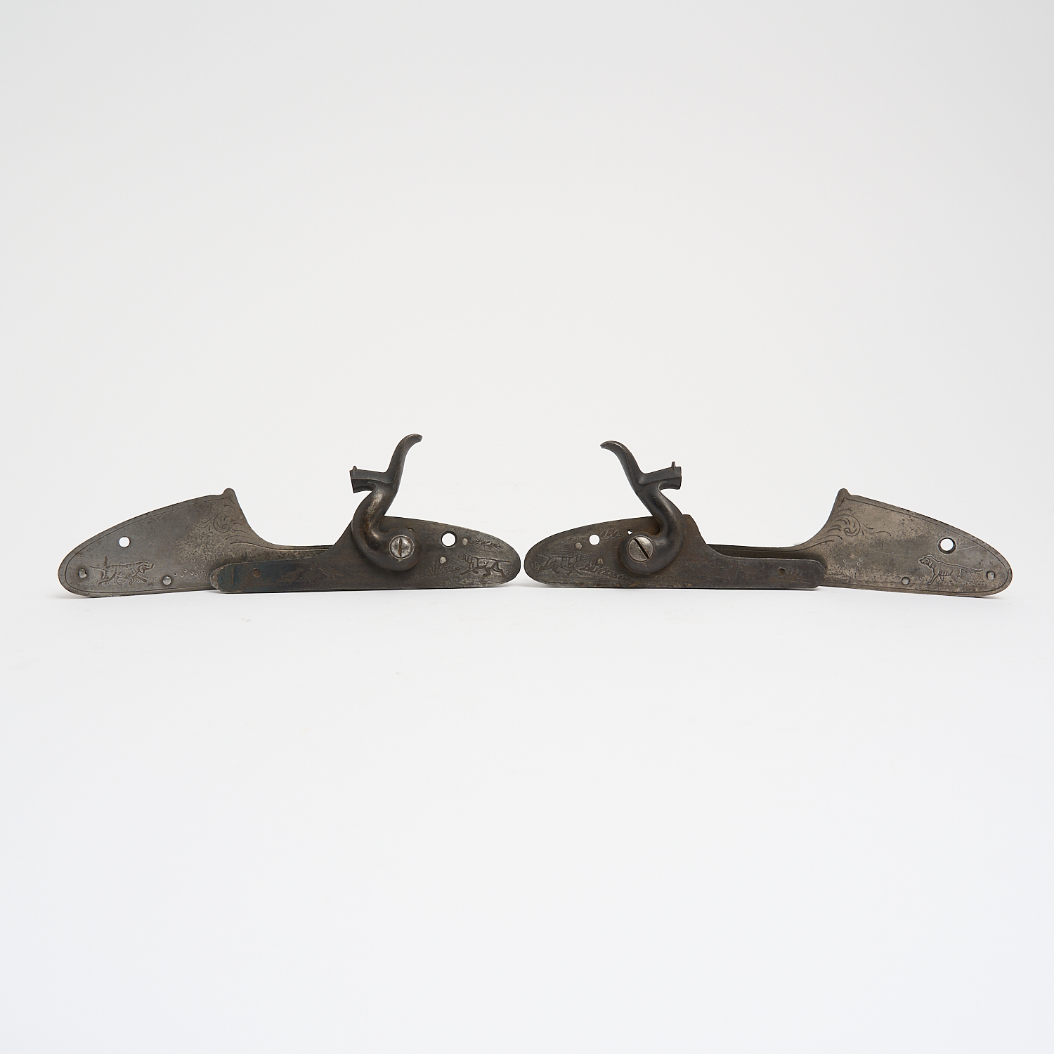 A COLLECTION OF FOUR 19TH CENTURY PURCUSSION LOCK COMPONENTS, ALL WITH DECORATIVE ENGRAVED HUNTING SCENES L.13.5CM (LONGEST)