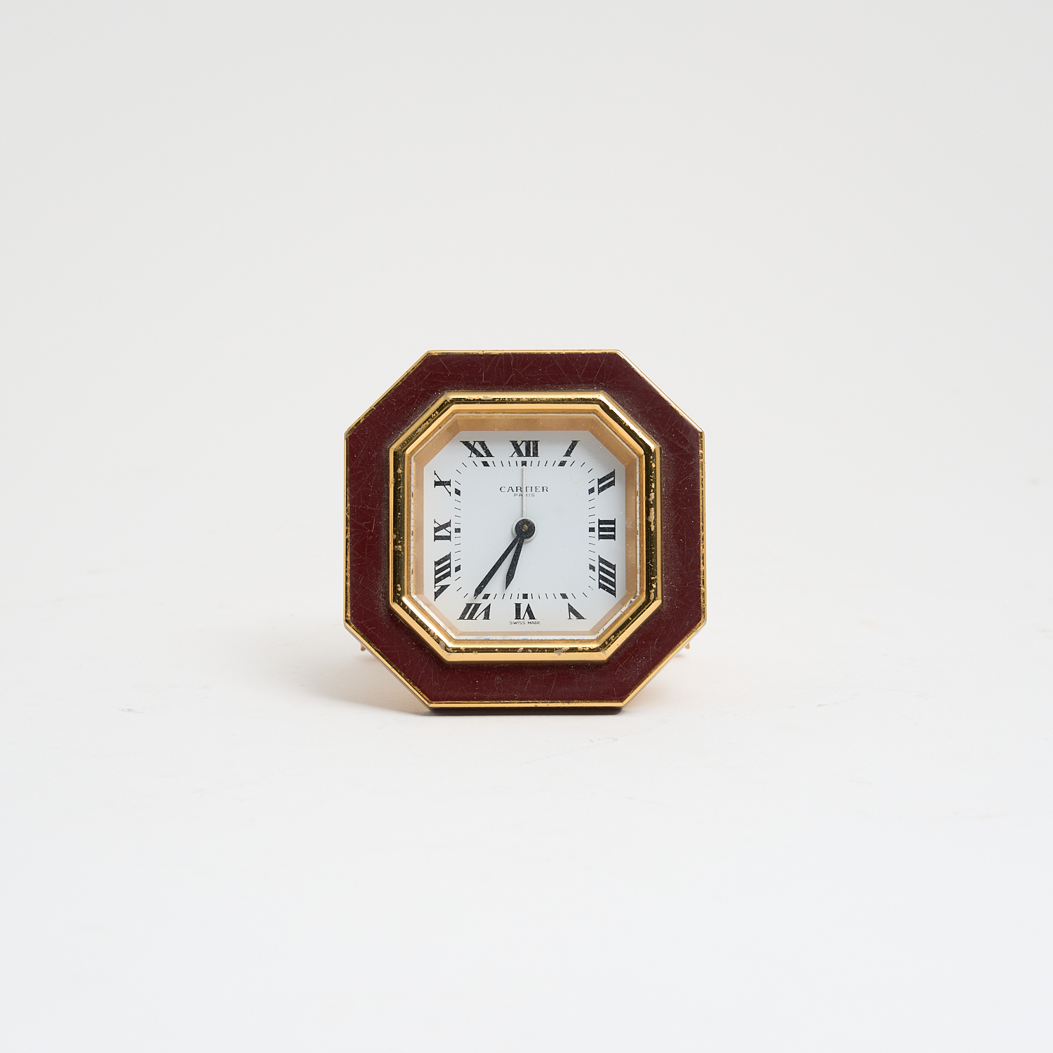 A CARTIER TRAVEL ALARM CLOCK, OF OCTAGONAL FORM, ENAMELED IN DEEP MAROON, WITH TRAVEL CASE, W.7.5CM