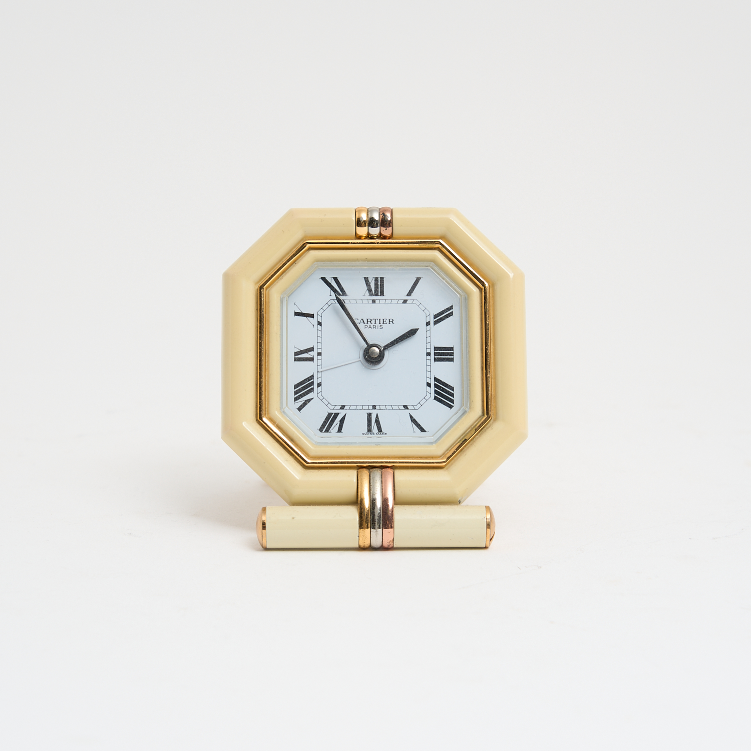 A CARTIER TRAVEL ALARM CLOCK OF OCTAGONAL FORM WITH IVORY ENAMEL AND HIGHLIGHTS, WITH TRAVEL CASE, (SMALL CHIP TO ENAMEL) W.8.5CM