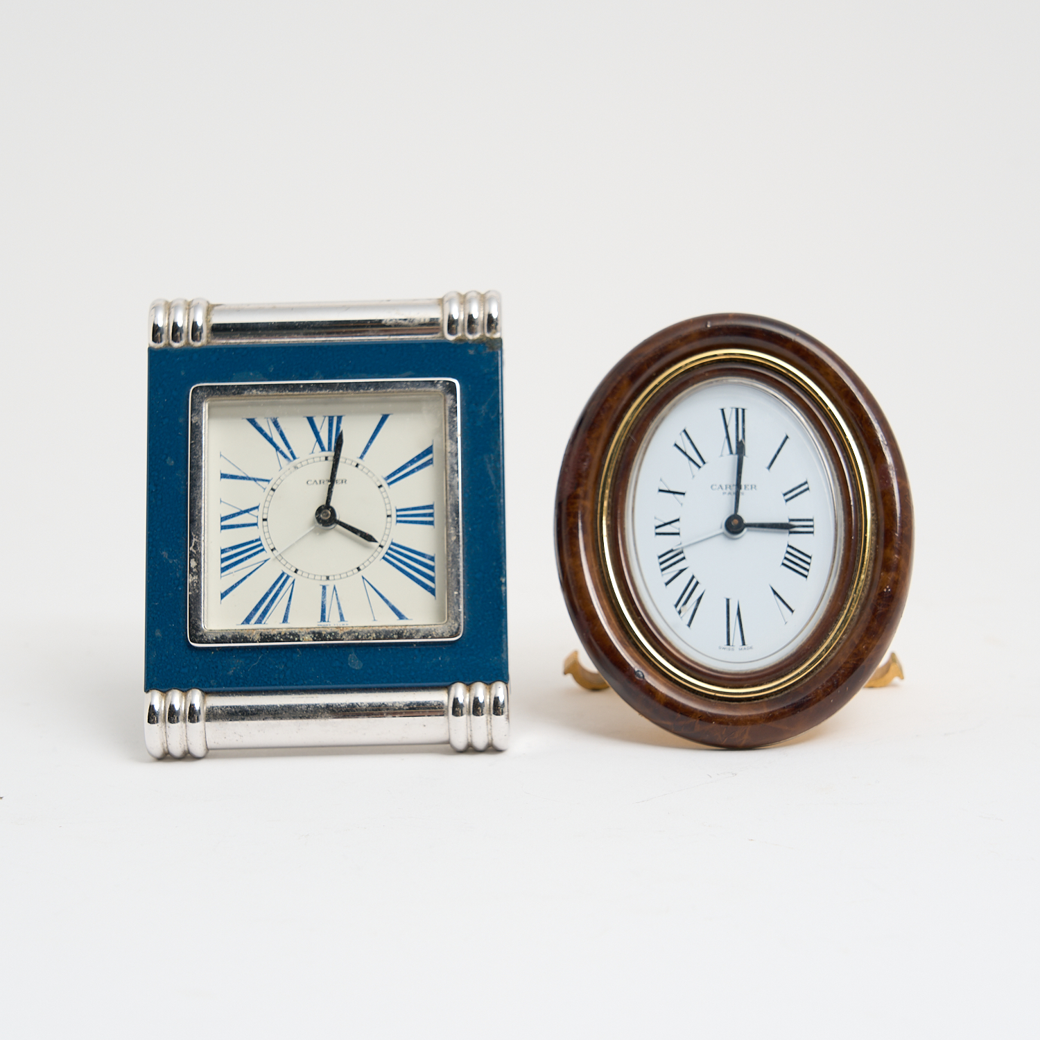 TWO CARTIER TRAVEL ALARM CLOCKS, ONE ENAMELED IN DEEP BLUE WITH CHROME HIGHLIGHTS, THE OTHER OF OVAL FORM WITH FAUX WALNUT FINISH H.10 CM (LARGEST)
