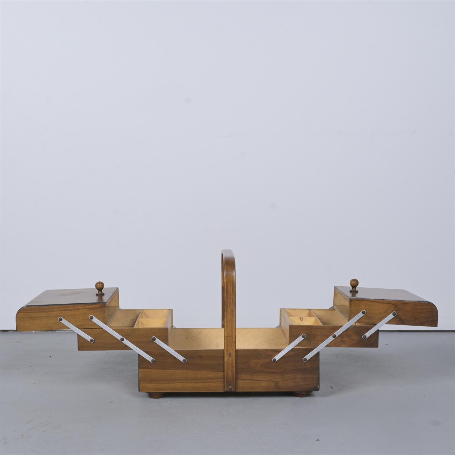 A GERMAN WALNUT SEWING CASE (40CM H X 52CM W X 34CM D)