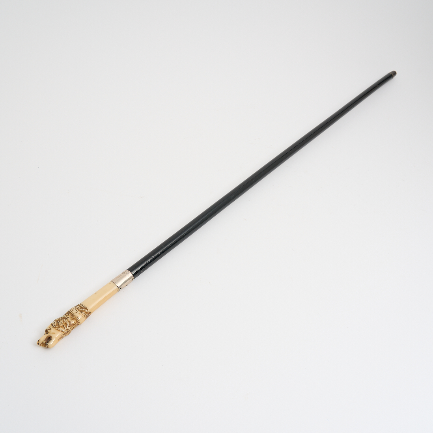 A 19TH CENTURY WALKING STICK WITH A CARVED MARINE IVORY DOG HEAD HANDLE, STERLING SILVER FERRULE, AND EBONISED SHAFT L.89.5CM