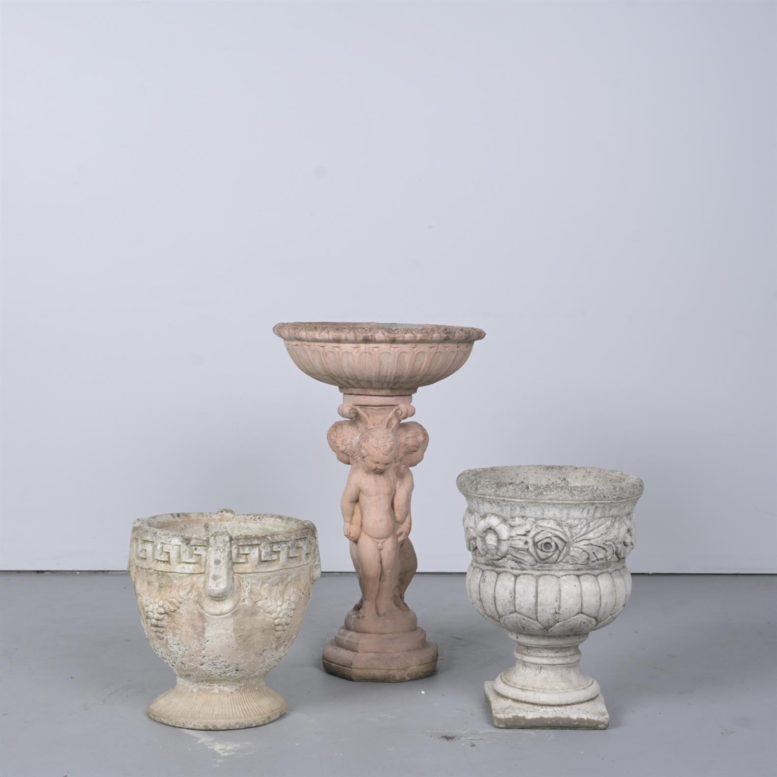 A FIGURAL BIRD BATH TOGETHER WITH TWO GARDEN URNS (70CM H X 150CM W X 86CM D, LARGEST) (THIS ITEM MUST BE REMOVED BY CARRIERS AT THE CUSTOMER'S EXPENSE. LEONARD JOEL STAFF CANNOT ASSIST CARRYING THIS ITEM)