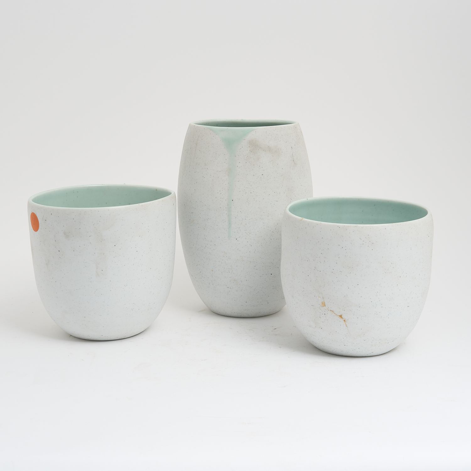 THREE CERAMIC POTS WITH GLAZED INTERIORS BY TAMARA HAHN (TWO SQUAT, ONE TALL) H.28CM (TALLEST)