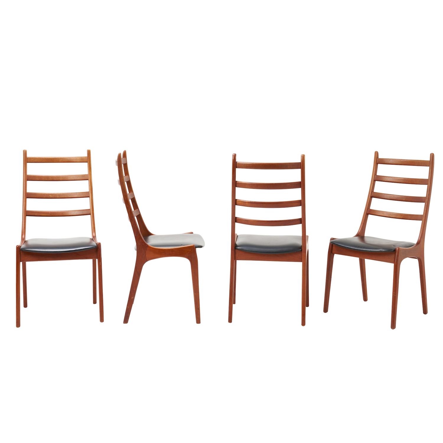 Teak with vinyl upholstered seats. Manufacturer's mark to base.