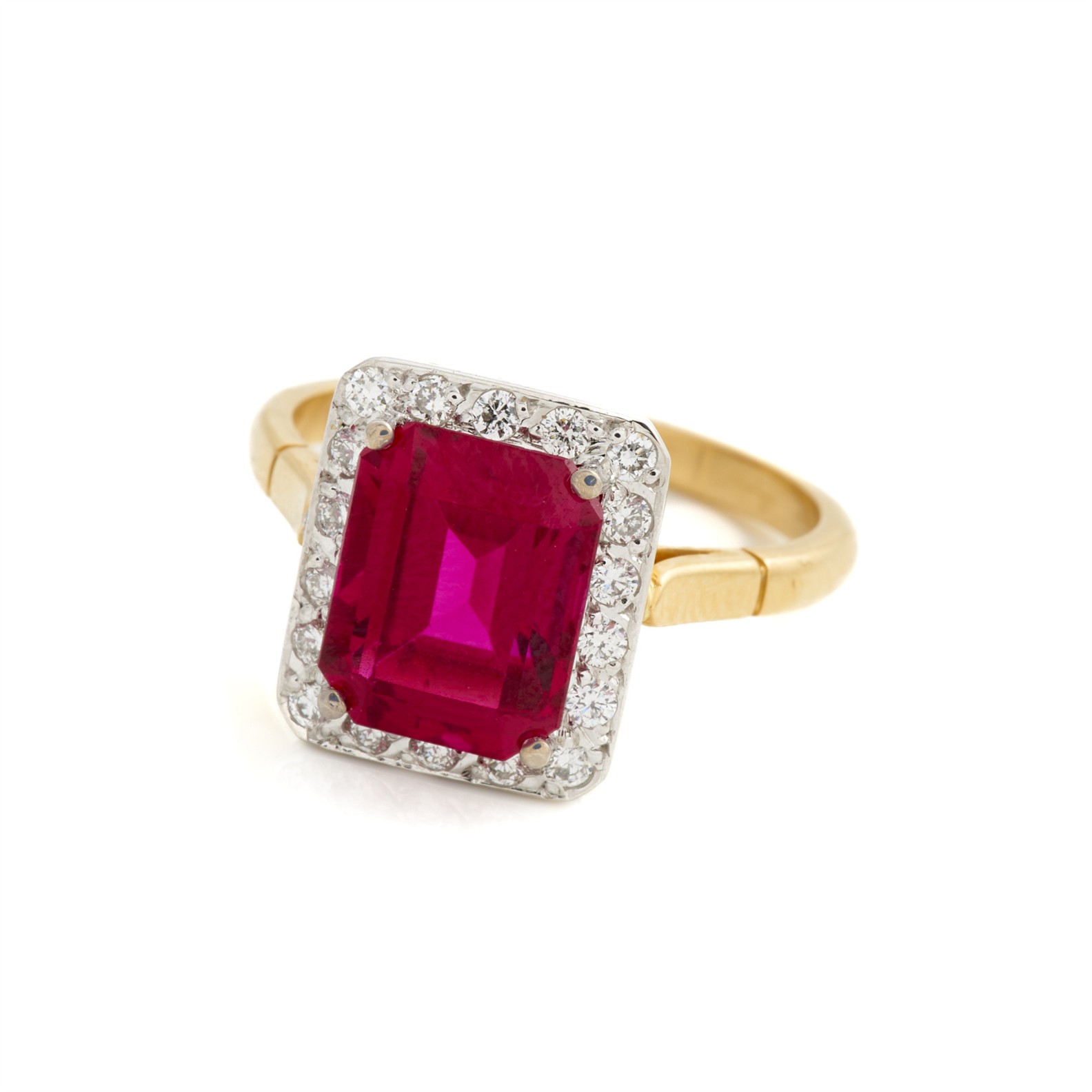 A SYNTHETIC RUBY AND DIAMOND RING, THE RUBY WEIGHING 4.16CTS, SIZE M, 5.3GMS
