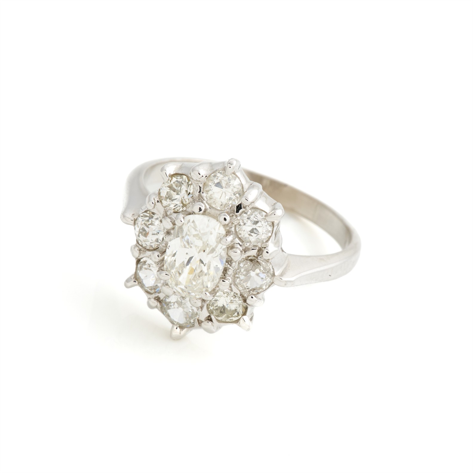 A DIAMOND CLUSTER RING IN 18CT WHITE GOLD, SIZE K, 3.7GMS