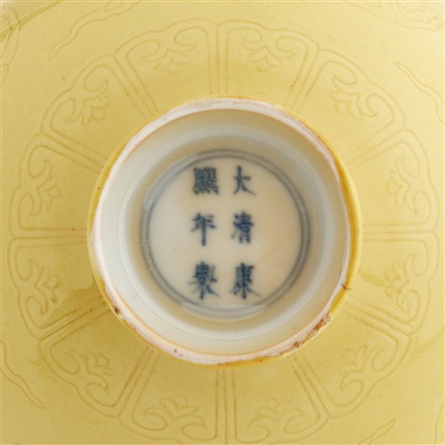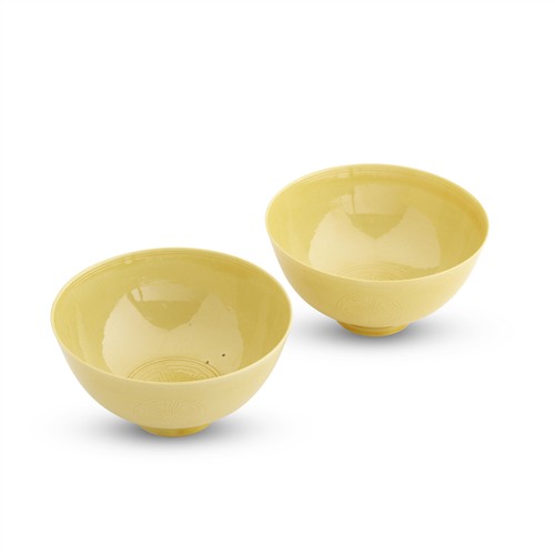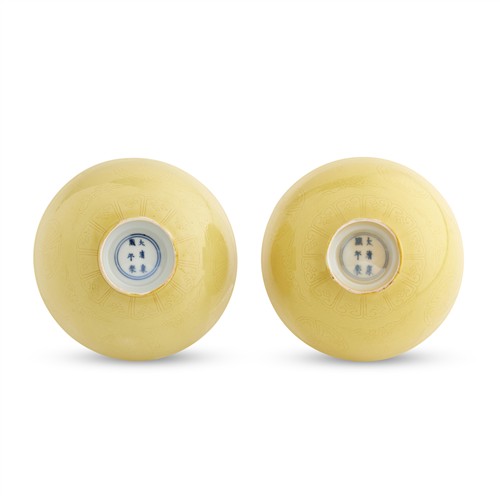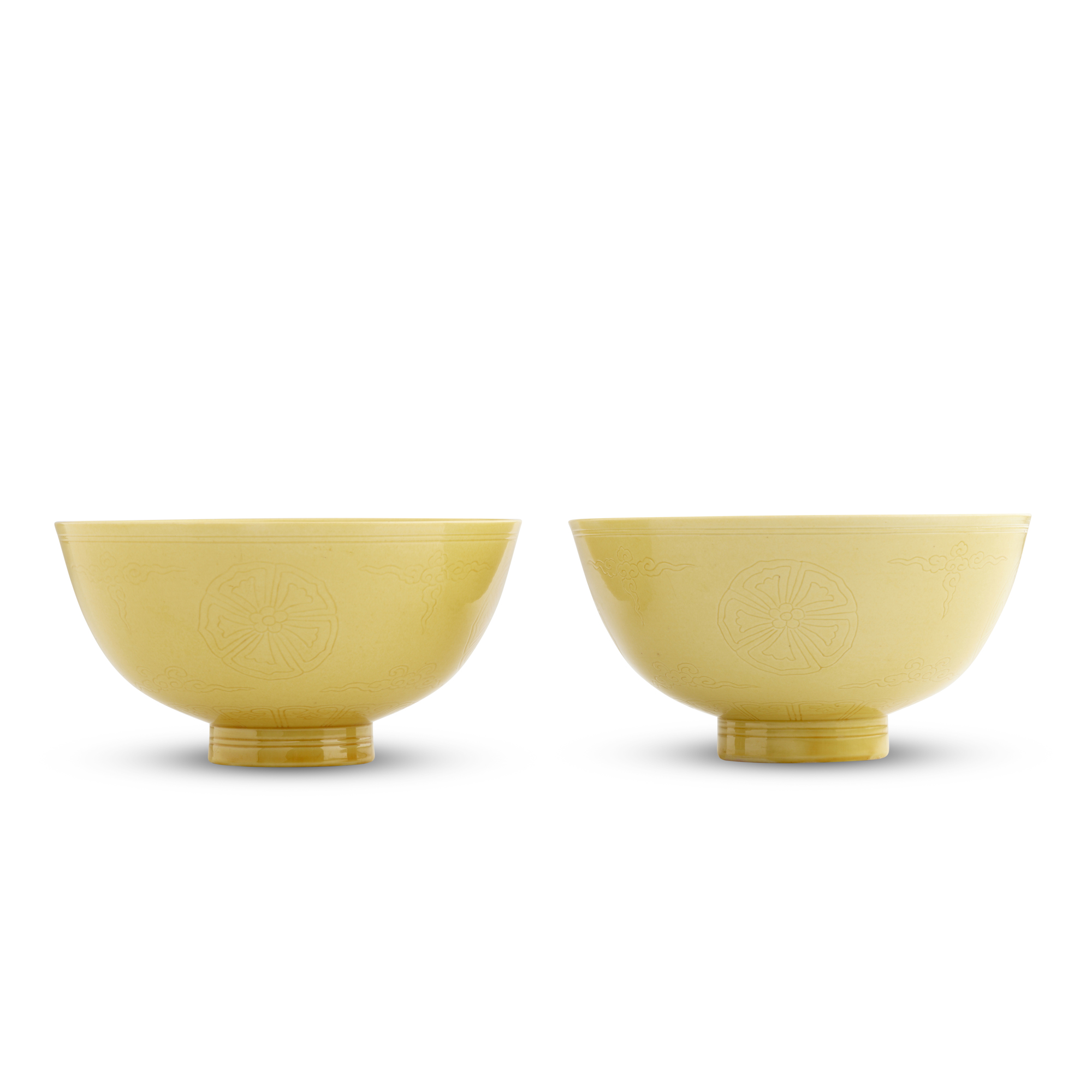 Each deep bowl is incised to the interior with a stylised floral medallion, and to the exterior with four medallions amid scrolling cloud motifs above a lappet border, all beneath a bright yellow glaze.
