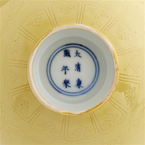 清康熙 「大清康熙年製」款及本朝 御製黃釉刻「團花」紋盌 一對