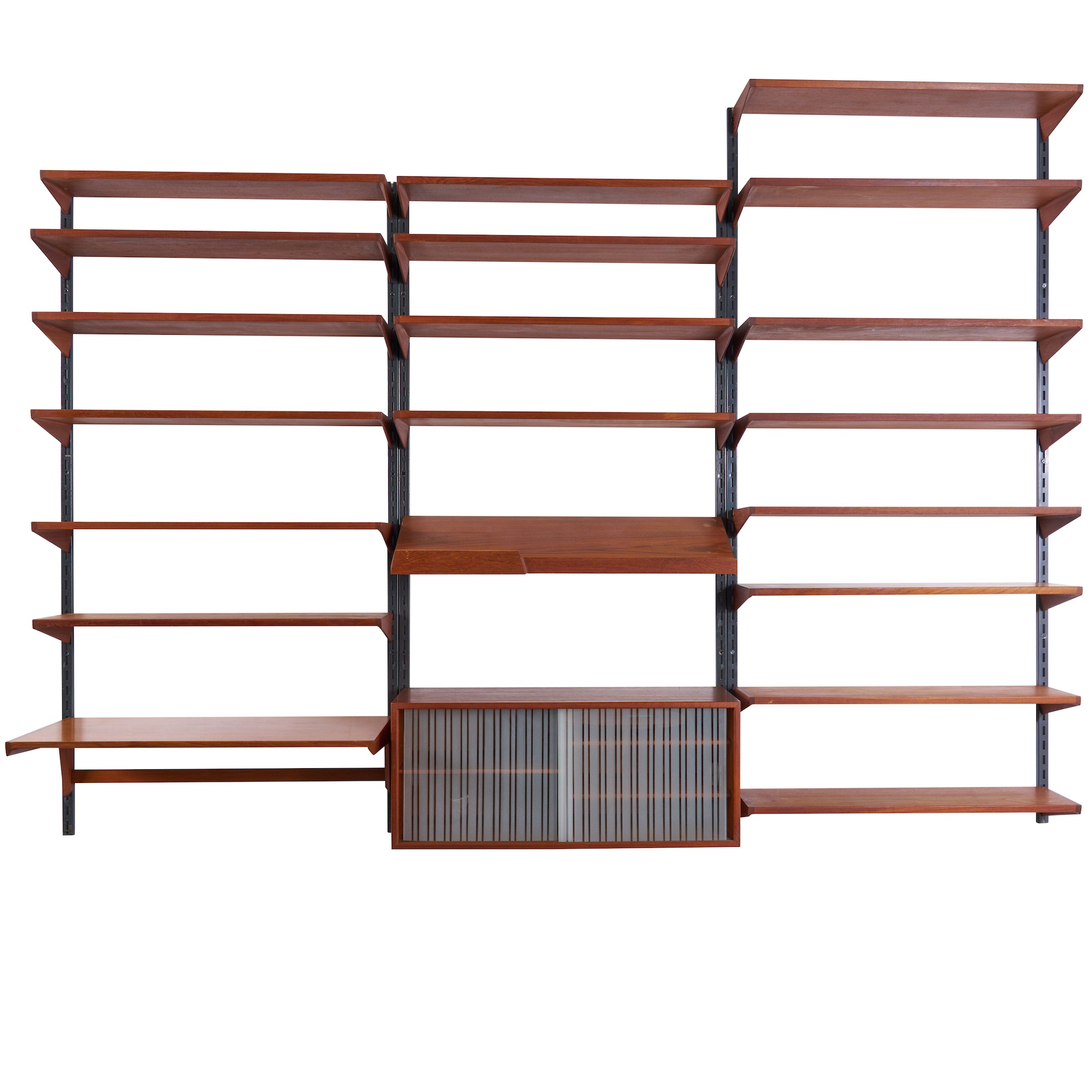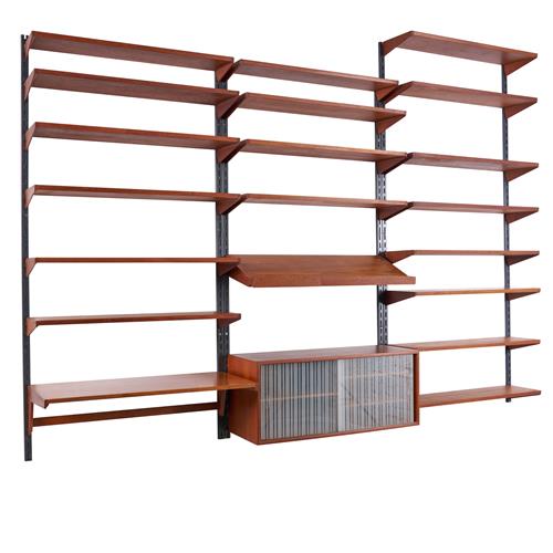 Scuffing and light scratches to shelves commensurate with age and previous use. Some shelves with slightly more wear than others. No significant structural or aesthetic faults. Glass on module is intact and doors slide smoothly. Minor variations in tone due to sun exposure.