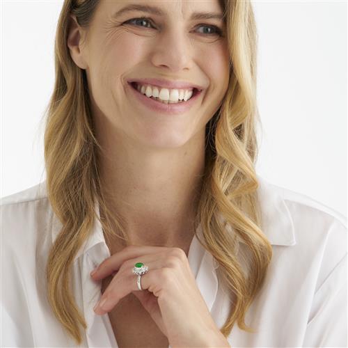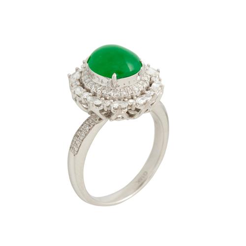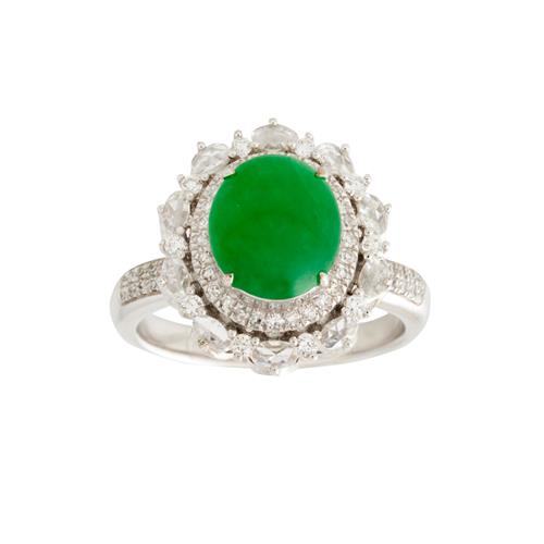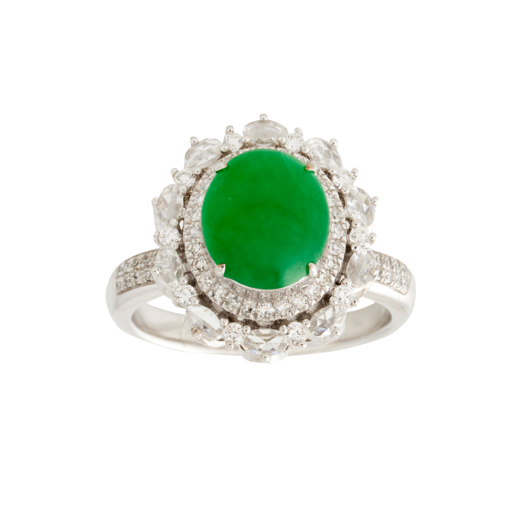 Of cluster design, centring a claw-set oval cabochon-cut Type 'A' jadeite weighing approximately 1.65 carats, surrounded by a row of claw-set single-cut diamonds and further surrounded by a row of alternating claw-set oval rose-cut and brilliant-cut diamonds, with pavé-set diamond shoulders, the diamonds together weighing approximately 0.50 carats, size J, gross weight approximately 4.35 grams.
