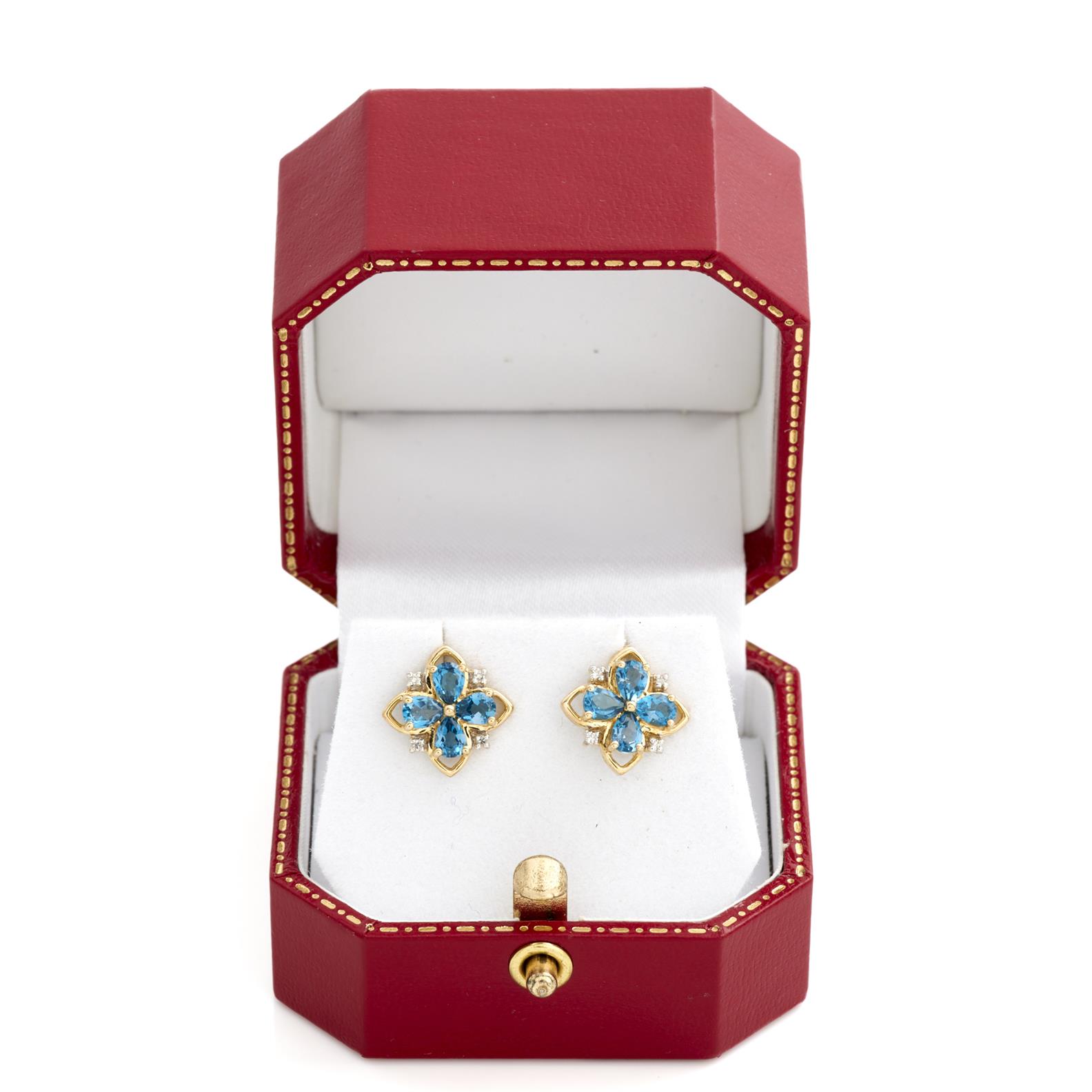 A PAIR OF BLUE TOPAZ AND DIAMOND EARRINGS IN 9CT GOLD, TO POST AND BUTTERFLY FITTINGS, 12MM, 1.8GMS