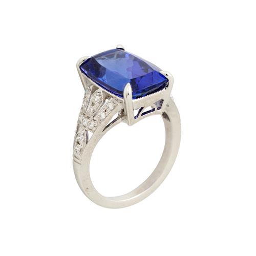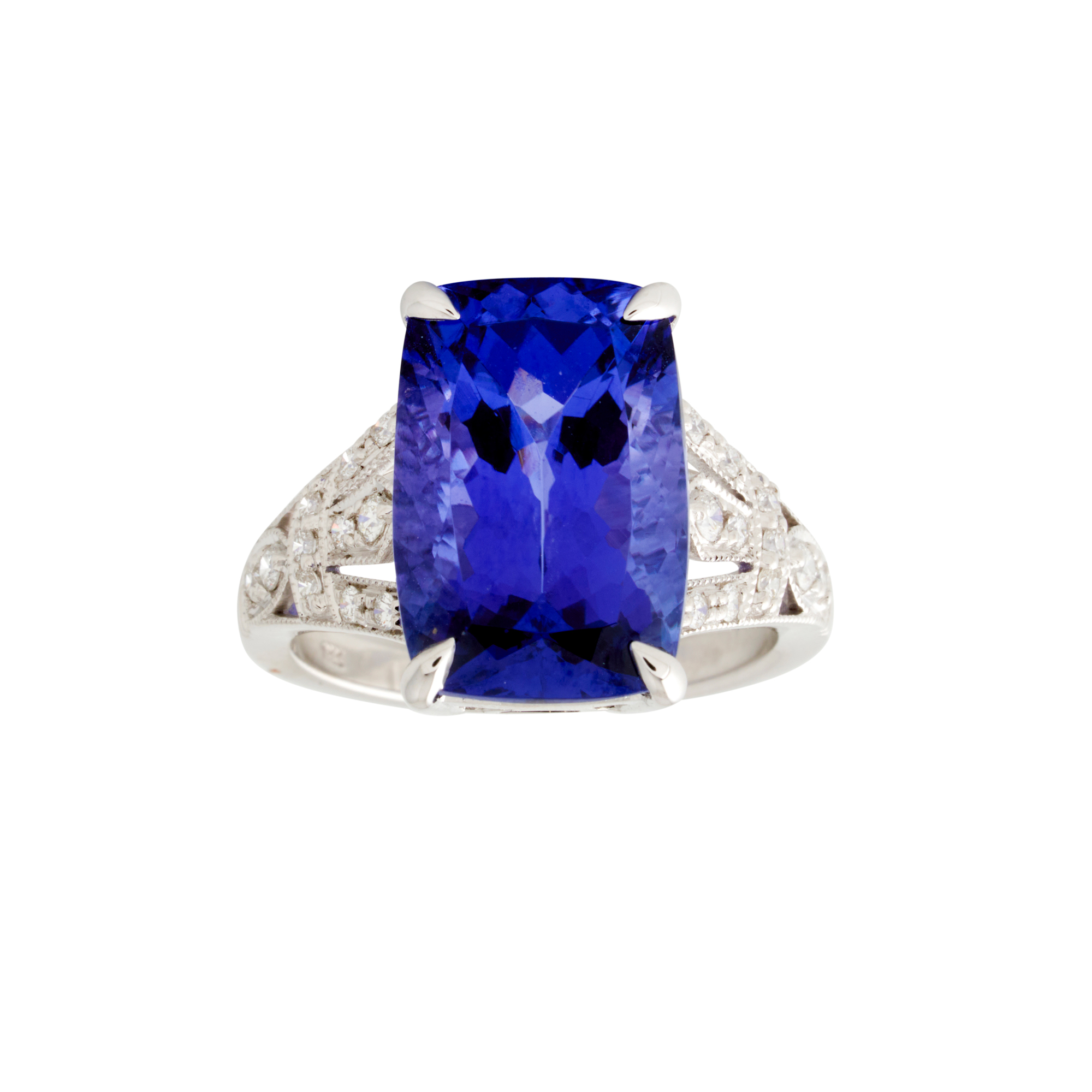 Corner claw-set with a modified brilliant-cut tanzanite weighing 9.17 carats, to decorative openwork shoulders detailed with grain-set brilliant-cut diamonds together weighing approximately 0.27 carats,