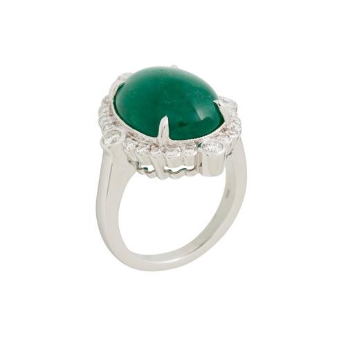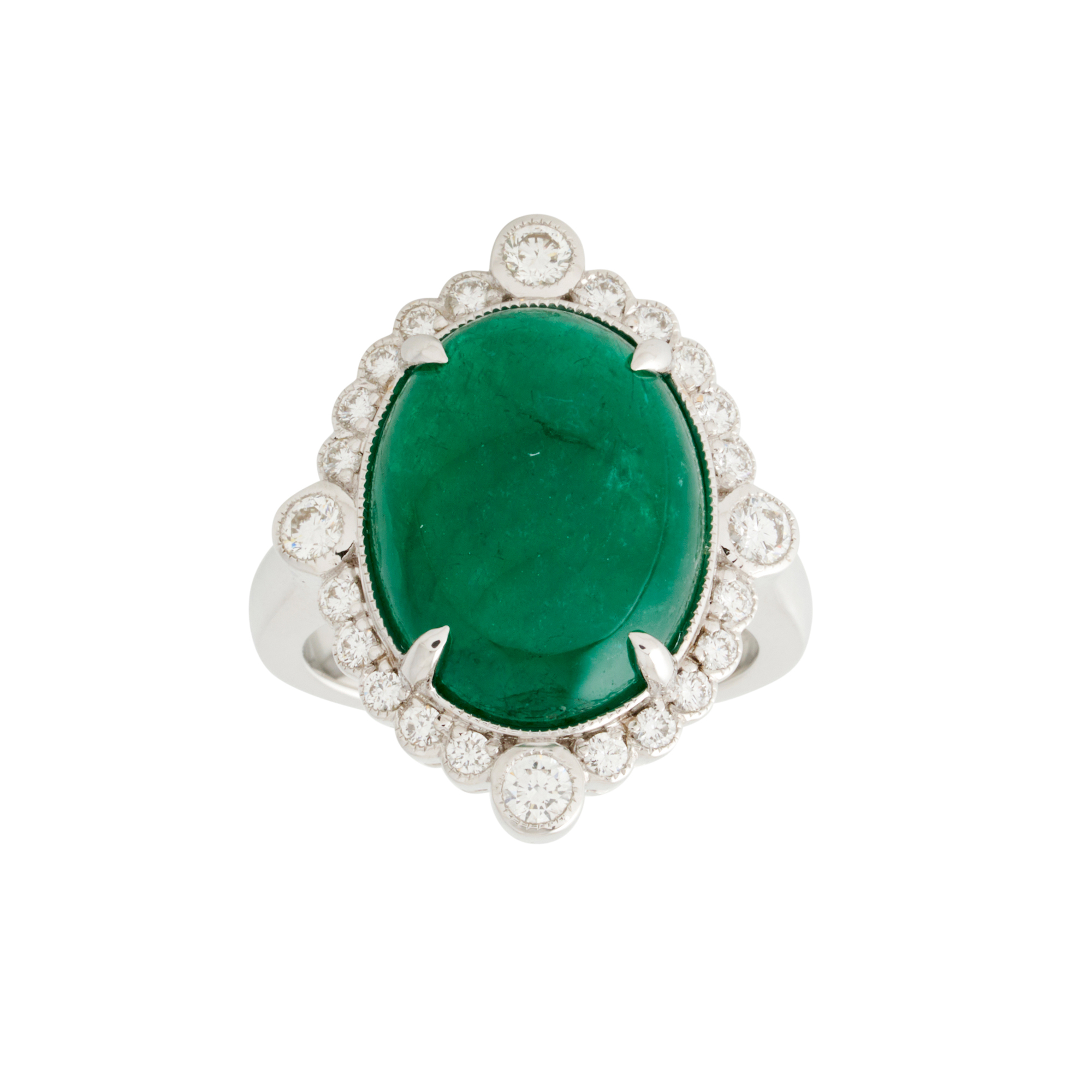 Of cluster design, centring a claw-set oval-cut emerald weighing 10.4 carats, within a surround of collet-set brilliant-cut diamonds together weighing approximately 0.70 carats, size M, gross weight approximately 9.9 grams.