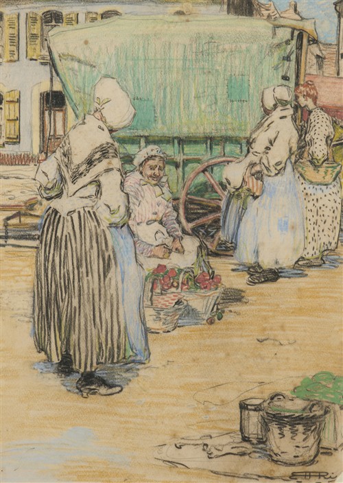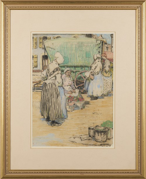 HILDA RIX NICHOLAS (1884-1961) In the Market Place, Etaples c.1912-1914 coloured pastel on paper 37 x 26.5cm (sheet, reveal)