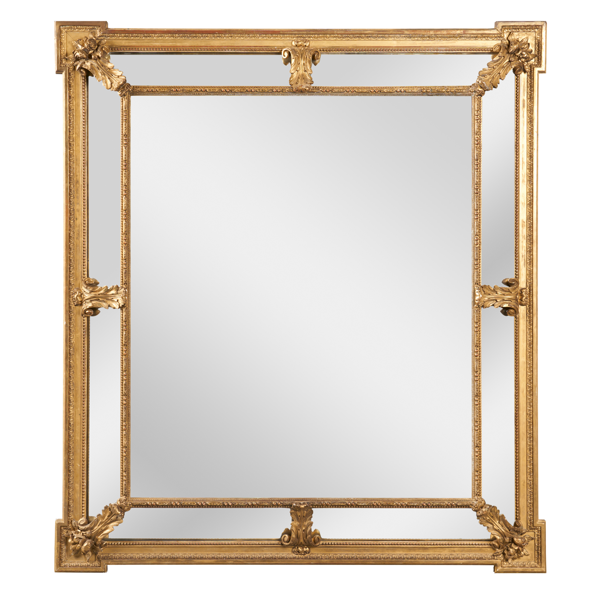 The bevelled rectangular main plate within receding marginal plates in a Classical-style moulded frame with projecting corners and acanthus and floral scrolls to the corners and centres of the marginal plates