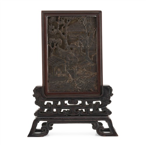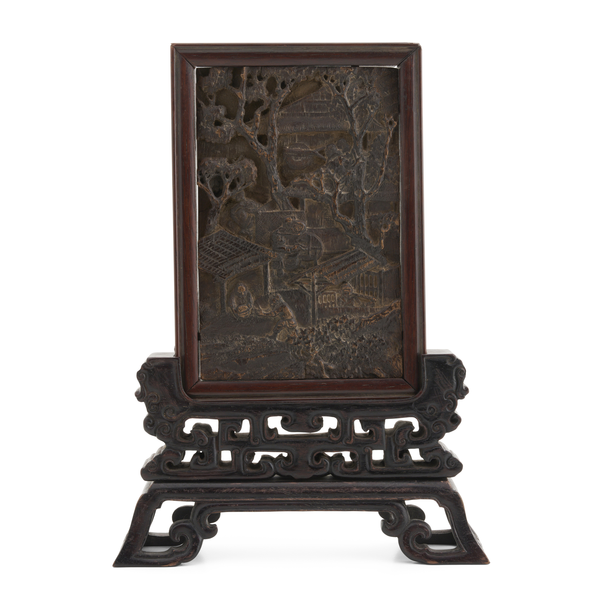 A CHINESE ALOESWOOD CARVED TABLE SCREEN, QING DYNASTY (1644-1911)