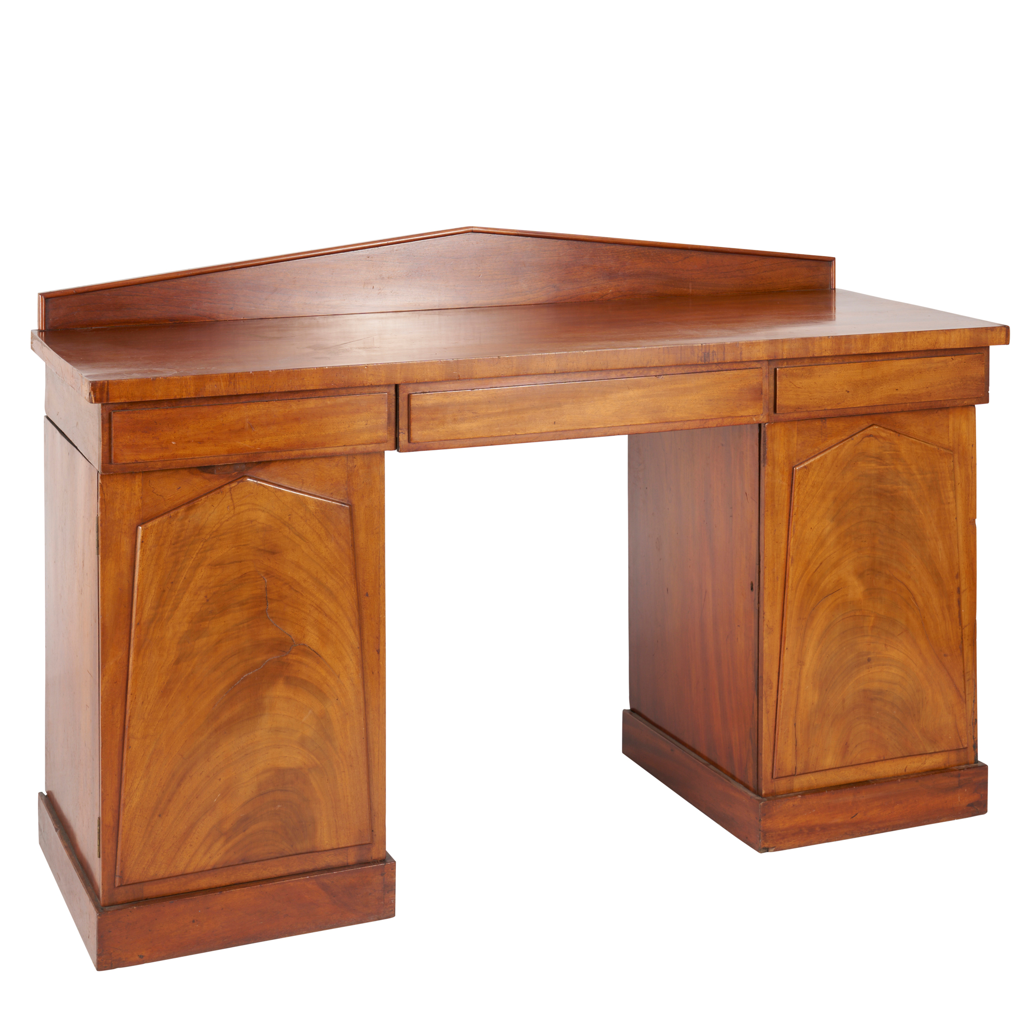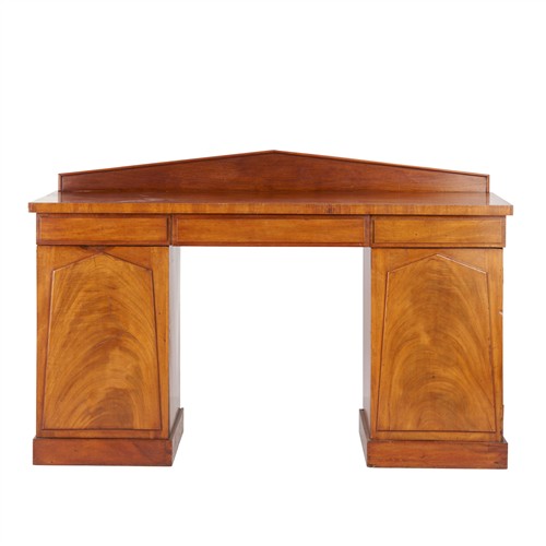 The low pediment back and thick projecting rectangular top above three frieze drawers with raised tablet fronts raised on a pair of pedestals, each with a door with raised pediment-topped panel enclosing the original fixed shelves, on plinth bases