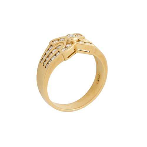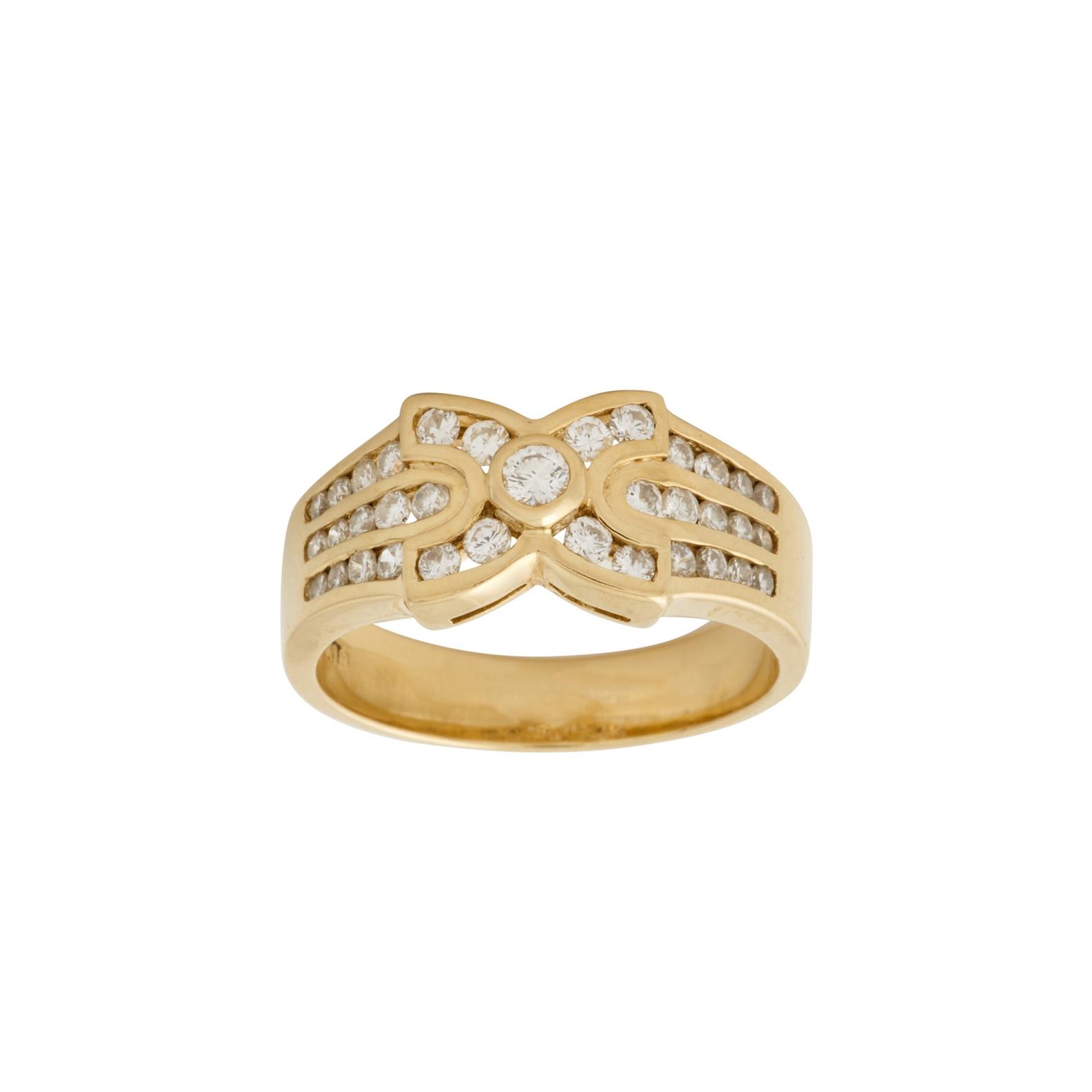 Designed as a 'X' motif channel and collet-set with brilliant-cut diamonds, to similarly set shoulders, the diamonds together stated to weigh 0.50 carats, mounted in 18ct gold, size L, gross weight approximately 5.1 grams.