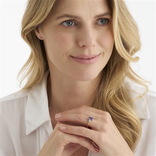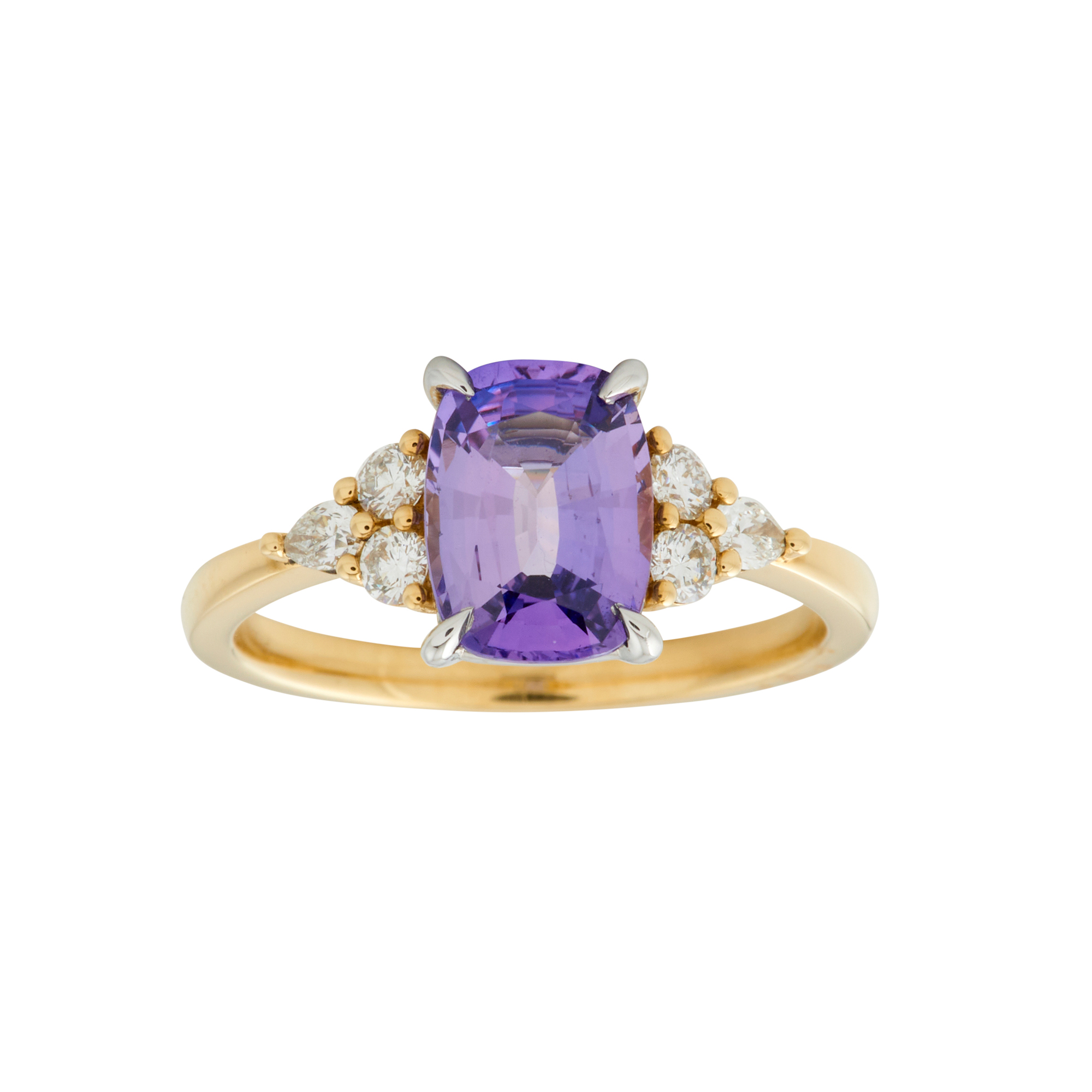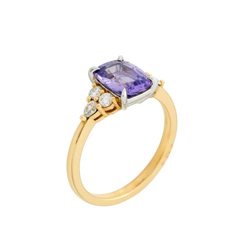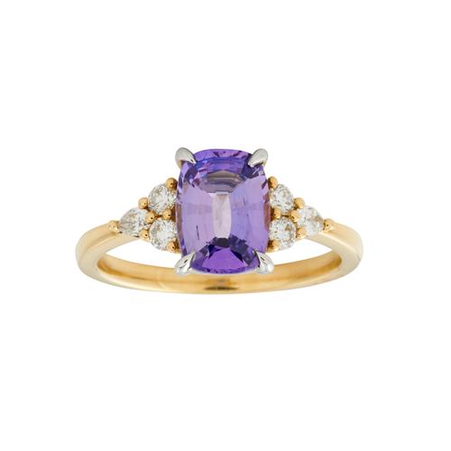 Centring a corner claw-set cushion-cut purple sapphire weighing 2.11 carats, flanked by a trefoil of brilliant-cut diamonds together weighing approximately 0.18 carats,